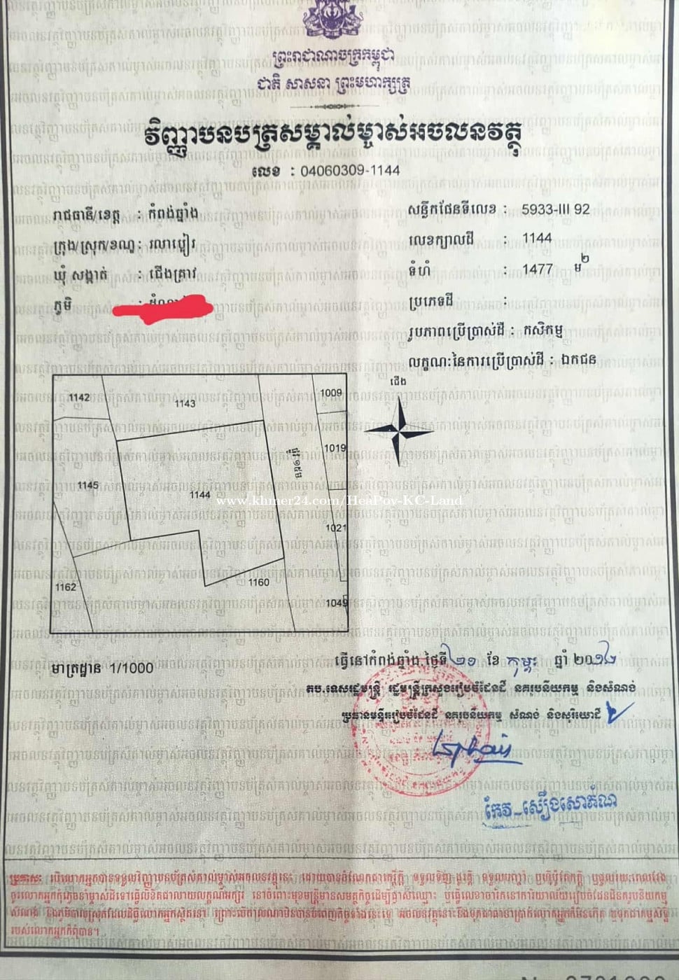 🔊#ដីលក់ជាប់ផ្លូវគ្រួសក្រហម ✍️ ទំហំ 1477 ម²(មុខ40ម)💰តំលៃ5200$ #ប្លង់រឹង ✍️ ដីជិតផ្ទះអ្នកភូមិ សាលារៀន មន្ទីពេទ្យ រមនីយដ្ឋាន កសិដ្ឋាន ដីឡូត៍ និងសហគ្រាស។ ✍️ អាចសាងសង់លំនៅឋាន ប្រកបអាជីវកម្ម និងទិញទុកចំណេញ។ 🚘 ចំងាយ6គមពីផ្លូវជាតិលេខ5 និង75គមពីភ្នំពេញ។ ⛳️ ទីតាំង: ឃុំជើងគ្រាវ ស្រុករលាប្អៀរ ខេត្តកំពង់ឆ្នាំង។ ☎️098652xxxClick To Call,092202xxxClick To Call,0883433xxxClick To Call 🇰🇭តេលេក្រាម 098652xxxClick To Call