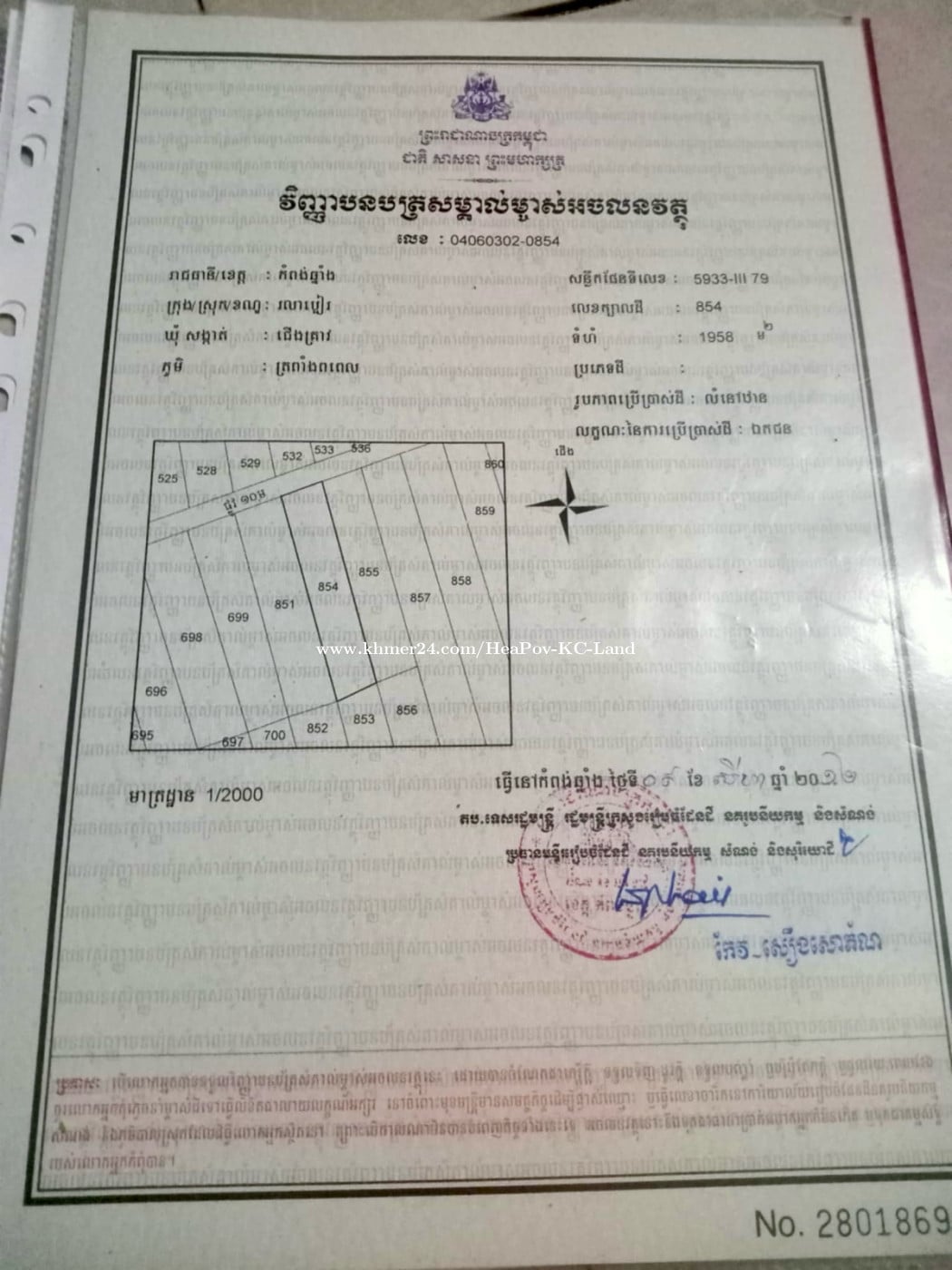 🔈 #ដីប្លង់រឹងលក់ជាប់ផ្លូវគ្រួសក្រហម 👌 ទំហំ3877 ម² (20*194ម)💰តំលៃ9900$ #កាត់ប្លង់រឹងជូន 👌 ដីជិតផ្ទះអ្នកភូមិ សាលារៀន ដីឡូតិ៍ សហគ្រាស កសិដ្ឋាន និងរមនីយដ្ឋាន។ 🚘 ចំងាយ6គមពីផ្លូវជាតិលេខ5 និង85គមពីភ្នំពេញ។ ⛳️ ទីតាំង: ឃុំជើងគ្រាវ ស្រុករលាប្អៀរ ខេត្តកំពង់ឆ្នាំង។ ☎️098652xxxClick To Call,092202xxxClick To Call,0883433xxxClick To Call 🇰🇭តេលេក្រាម 098652xxxClick To Call
