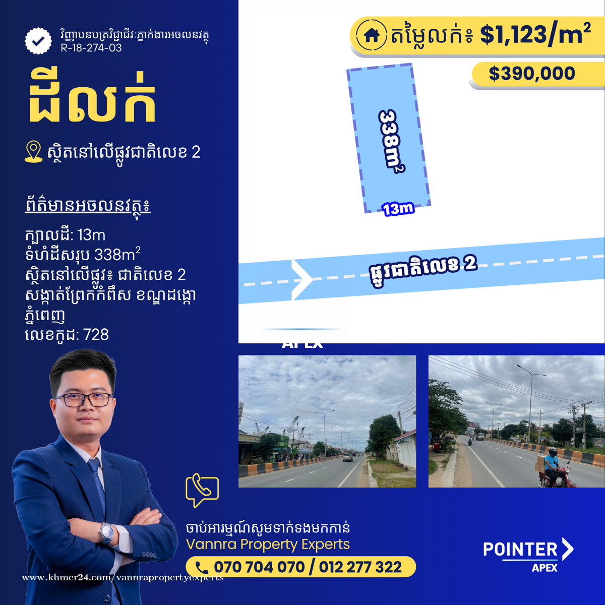 ដីសម្រាប់លក់លើផ្លូវជាតិលេខ2 សម្រាប់លក់:$390,000 ទំហំដី: 13m x 30m (338m2) 🔐លេខកូដអចលនវត្ថុ៖ 728 📌 លើផ្លូវជាតិលេខ2 សង្កាត់ព្រែកកំពឹស ខណ្ឌដង្កោ ភ្នំពេញ ——————————— ទាក់ទងមកឥលូវនេះ៖ Call: 070704xxxClick To Call / 012277xxxClick To Call Telegram: https://t.me/vannraaa 微信号: vannra-experts - Channel: https://t.me/vannrapropertyexperts - Tiktok: https://www.tiktok.com/@vannra_property_experts - Facebook: https://www.facebook.com/vannra.phnompenh.property/