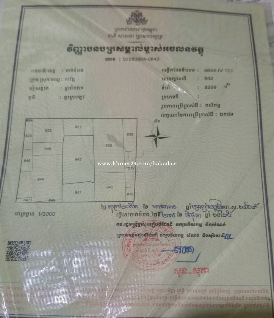 ដីស្អាតមានជីមានជីជាតិល្អ អាចធ្វើស្រែបានគ្រប៎រដូវ នៅឡូទី2 ពីផ្លូវ ខាង ក្រោយដៅមានផ្ទះត្រចៀកកាំ ប្លង់រឹង 8268 m2 តំលៃចរចារបាន Tel: 012776xxxClick To Call/087222xxxClick To Call