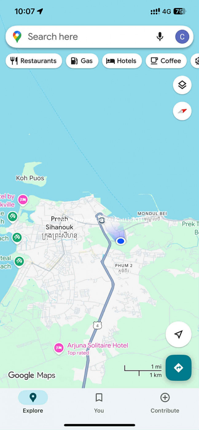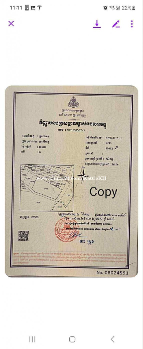 ទីតាំងលើភ្នំមើលឃើញសមុទ្រ ទីតាំងក្នុងក្រុង ចុះពីផ្លូវលេខ ៤ ប្រហែល ៤០០ ទៅ ៥០០ ម៉ែត្រ ជាដីអំណោយផលមានទេសភាពស្អាតនៅជាប់ក្រុង មានប្លង់រឹងស្រាប់ ទំហំ 10852ម៉ែត្រការ៉េ ទីតាំង : 38 , Krong Preah Sihanouk , Sangkat Bei តម្លៃ :500$/ម៉ែត្រការ៉េ (តម្លៃក្នុងចរចា) Tel :078/093954xxxClick To Call