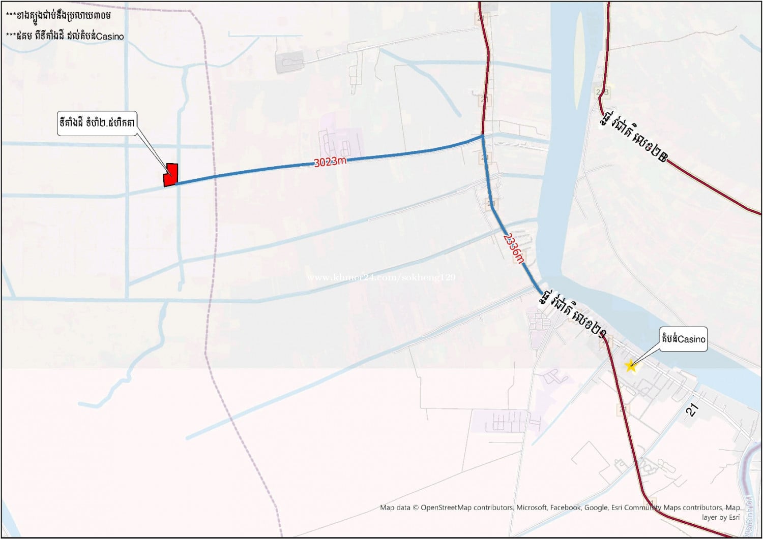 -មានចម្ងាយ៥គម ពីទីតាំងដីទៅតំបន់ Casino -ទីតាំងដីមានការអភិវឌ្ឍន៍បណ្តើរៗ មានអគារធំៗរោងចក្រកំពុងសាងសង់ -ទីតាំងដីខាងត្បូងជាប់ផ្លូវភ្លោះ ប្រលាយ30m (ផ្លូវ10mសងខាងប្រលាយ) -27$/m2 (តម្លៃអាចចរចារគ្នាបាន)