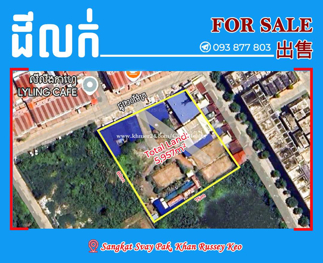 ⭕️ដីលក់ នៅស្វាយប៉ាក 🆔10125-1 💢ទំហំដី: 75m x 80m (5,957m2) 💢តម្លៃលក់: $470/m2 ចរចារ 💢ផ្លូវមុខទទឹង២០ម៉ែត្រ ☎️ 𝟎𝟗𝟑 𝟖𝟕𝟕 𝟖𝟎𝟑 𝙩𝙚𝙡𝙚𝙜𝙧𝙖𝙢: https://t.me/cparealtors 𝙬𝙚𝙘𝙝𝙖𝙩 𝙄𝘿: 𝘾𝙋𝘼_𝙍𝙚𝙖𝙡𝙩𝙮 𝙩𝙚𝙡𝙚𝙜𝙧𝙖𝙢 𝙘𝙝𝙖𝙣𝙣𝙚𝙡: https://t.me/cparealty