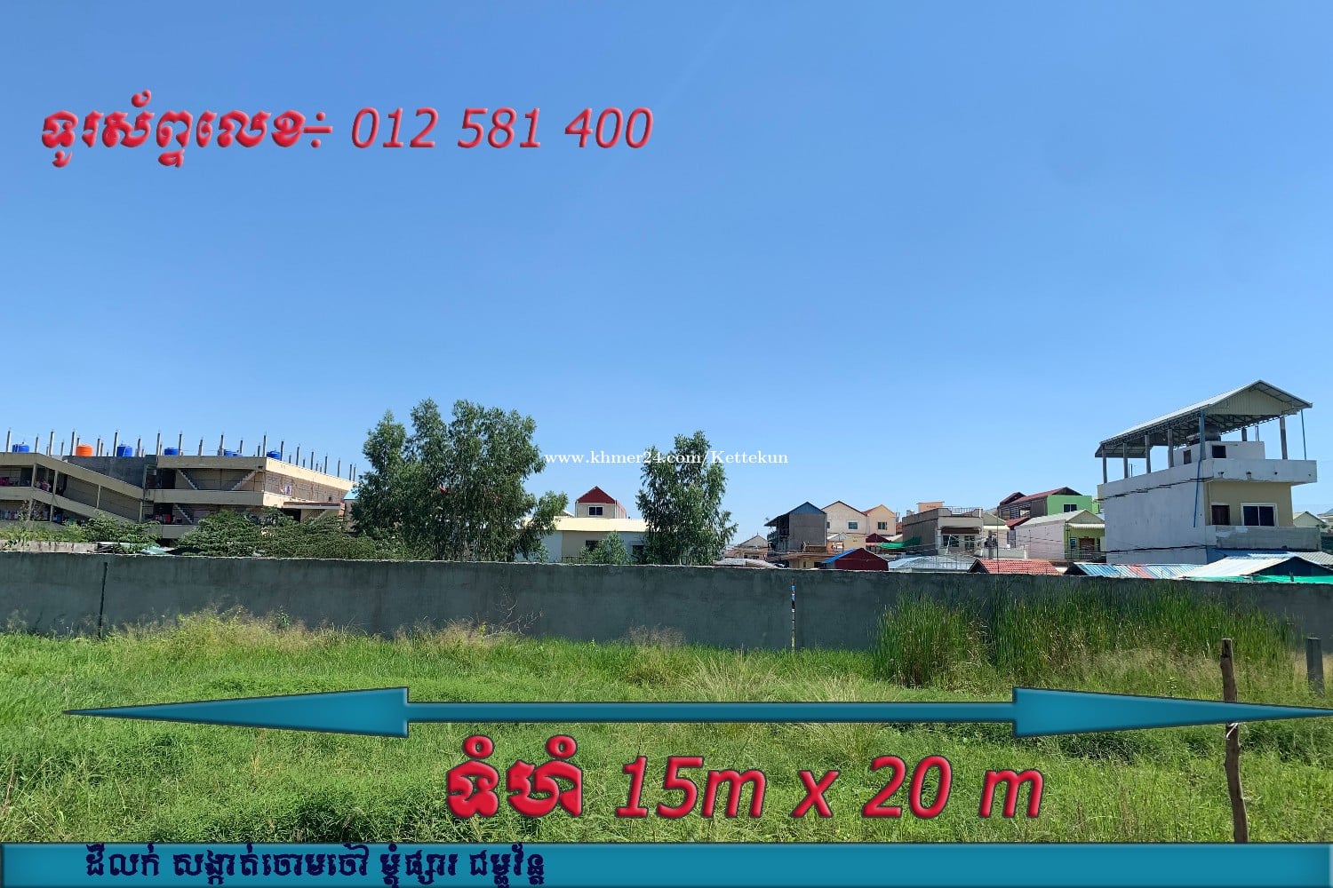 📣ដីលក់ 📍ទីតាំងស្ថិតនៅ : ម្តុំផ្សារជម្ពូវ័ន្ត ខណ្ឌពោធិ៍សែនជ័យ រាជធានីភ្នំពេញ 👉ទហំដី : 15m x 20m តម្លៃអាច ចរចារបាន ☎️Tel : 0968886xxxClick To Call 089933xxxClick To Call 012581xxxClick To Call (cellcart) *** លក្ខណះពិសេស 👍ទីតាំងល្អ នៅជិតបណ្តុំរោងចក្រ 👍ដីអាចសង់ជាផ្ទះល្វែង បន្ទប់ជួលបាន។