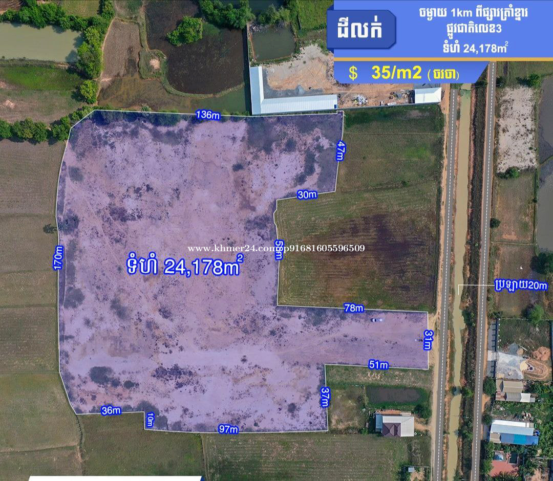 ដីលក់ | Land for Sale – 2.4 Hectares 📍 ទីតាំង: ភូមិព្រៃរោង, ឃុំជង្រុក, ស្រុកគងពិសី, ខេត្តកំពង់ស្ពឺ 📏 ទំហំដីសរុប: 24,178m² (2.4ha) 💰 តម្លៃ: $25/m² (ចរចាបាន) 📄 ប្លង់: ប្លង់រឹង 🛣️ ស្ថិតនៅចម្ងាយ: 1km ពីផ្សារត្រាំខ្នា 1km ពីផ្លូវជាតិលេខ 3 🏗️ ជិត: រោងចក្រ សាលារៀន មន្ទីរពេទ្យ គម្រោងផ្ទះល្វែង និងដីឡូត៍ ✅ ល្អសម្រាប់: សាងសង់ជាឃ្លាំង ផែស្ងួត ផ្ទះល្វែង ពុះឡូត៍ ភោជនីយដ្ឋាន វិនិយោគទុកចំណេញរយៈពេលវែង 📞 សម្រាប់ពិនិត្យទីតាំង និងព័ត៌មានបន្ថែម: 📱 015777xxxClick To Call (Smart) 📱 099755xxxClick To Call (Cellcard) 📱 099879xxxClick To Call (Cellcard) 📍EP Code: EP1244