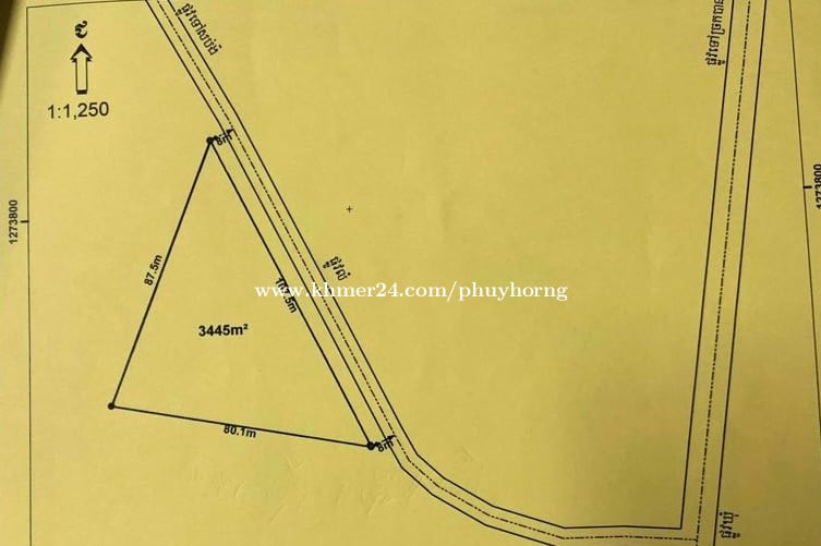 ដីរាងត្រីកោណ ទំហំដី 107.5m x 87.5m x 80.1m ទំហំសរុប 3355ម៉ែត្រការ៉េ ផ្លូវលំខាងលើ 15m ផ្លូវខាងកៀន 6m តម្លៃ 7xxxx$ តំបន់ល្អ រអ៊ូអរ សំបូរទៅដោយរោងចក្រ នៅម្តុំនោះ ទីតាំងនៅភូមិ ឯករាជ្យ ឃុំ ខ្ចុំក្រាំង ស្រុកសំរោងទង ខេត្តកំពង់ស្ពឺ