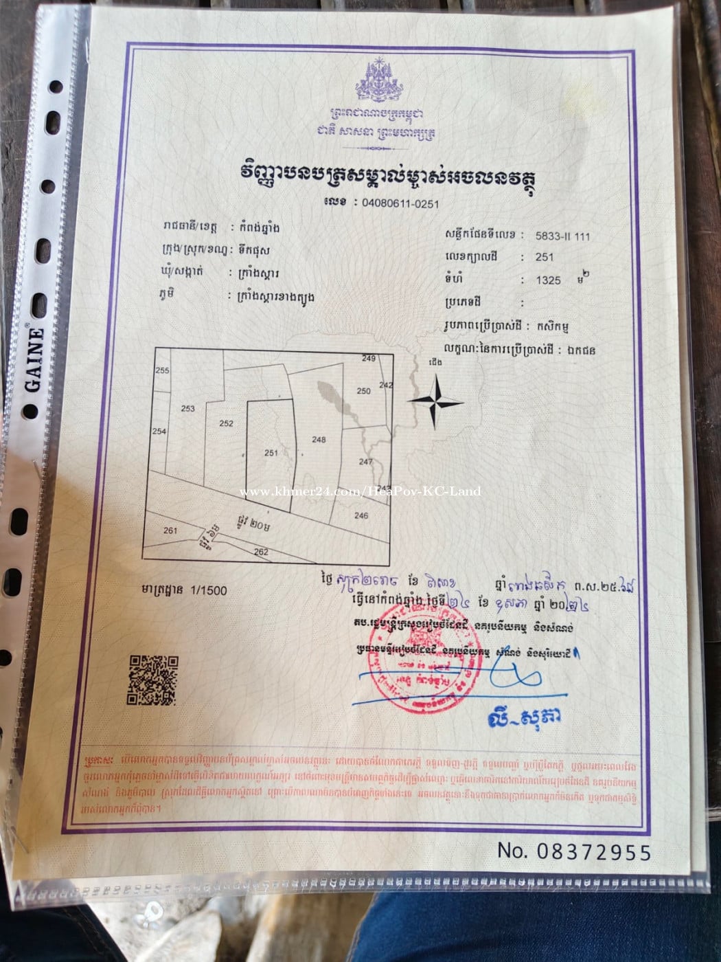 🙏 #ដីលក់បន្ទាន់លើផ្លូវរដ្ឋ20ម៉ែត ✅ ទំហំ1325ម²(25*53ម)💰តំលៃ5900$ #កាត់ប្លង់រឹងជូន 🚘 ចំងាយ25គមពីផ្លូវជាតិលេខ5 និង117គមពីភ្នំពេញ។ ⛳️ ទីតាំង: ឃុំក្រាំងស្គារ ស្រុកទឹកផុស ខេត្តកំពង់ឆ្នាំង។ ☎️098652xxxClick To Call,092202xxxClick To Call,0883433xxxClick To Call 🇰🇭 តេលេក្រាម 098652xxxClick To Call