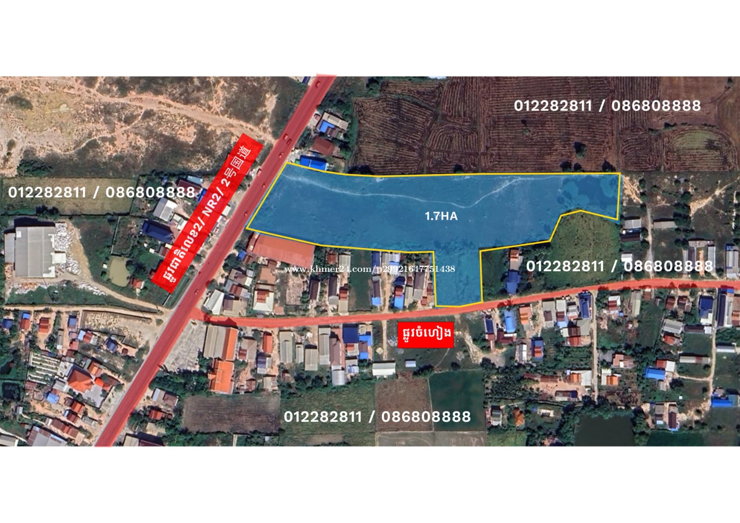 ដីលើផ្លូវជាតិលេខ២សម្រាប់លក់ ឬជួល 🔺 មានផ្លូវចំហៀងងាយស្រួលឡានធំចេញចូល 🔺ទំហំ1.7ហិតា 🔺ចាក់ដីហើយស្រាប់អាចធ្វើឃ្លាំងបាន 🔺ដីមានប្លង់រឹង គីឡូលេខ ៣៧ ផ្លូវជាតិលេខ២ ភូមិហនុមាន ឃុំក្រាំងធ្នង់ ស្រុកបាទី ខេត្តតាកែវ