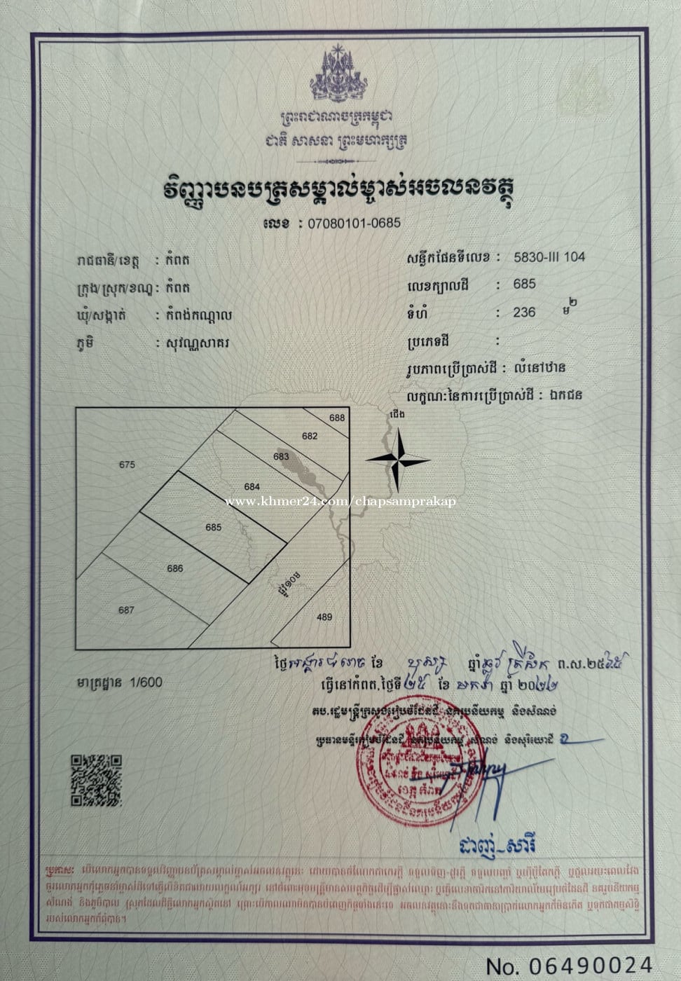 ដីលំនៅដ្ឋានដាក់លក់ $99,999 👉ទីតាំងកណ្តាលក្រុងកំពត 250 ឞ៉ែត្រ ពីព្រែកធំ និង 800 ម៉ែត្រ ពីសាលាខេត្តកំពត បាញ់ទឹករាំ នាឡិកាយក្ស សេះសមុទ្រ 👉ប្លង់រឹង 👉ក្បាលដី 10ម ជំរៅ 24ម (ក្នុងប្លង់រឹង 236 ម៉ែត្រការ៉េ) 👉បច្ចុប្បន្នមានដាំដំណាំតិចតួចដូចជា ចេក ដូង ទៀប ស្វាយ (មិនមានសំណង់រឹងទេ) 👉ម្ចាស់ផ្ទាល់តែម្តង 👉Telegram 012225xxxClick To Call or 016222xxxClick To Call