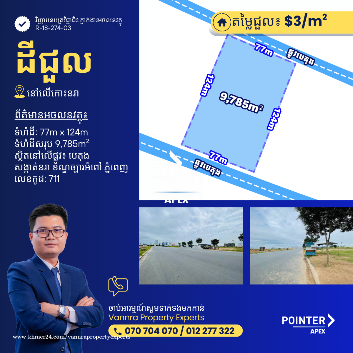 ដីសម្រាប់ជួលនៅលើកោះនរា សម្រាប់ជួល:$3/m2 ទំហំដី: 77m x 124m (9785m2) 🔐លេខកូដអចលនវត្ថុ៖ 711 📌 លើកោះនរា ខណ្ឌច្បារអំពៅ ភ្នំពេញ ——————————— ទាក់ទងមកឥលូវនេះ៖ Call: 070704xxxClick To Call / 012277xxxClick To Call Telegram: https://t.me/vannraaa 微信号: vannra-experts - Channel: https://t.me/vannrapropertyexperts - Tiktok: https://www.tiktok.com/@vannra_property_experts - Facebook: https://www.facebook.com/vannra.phnompenh.property/