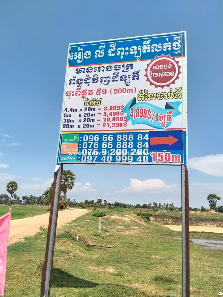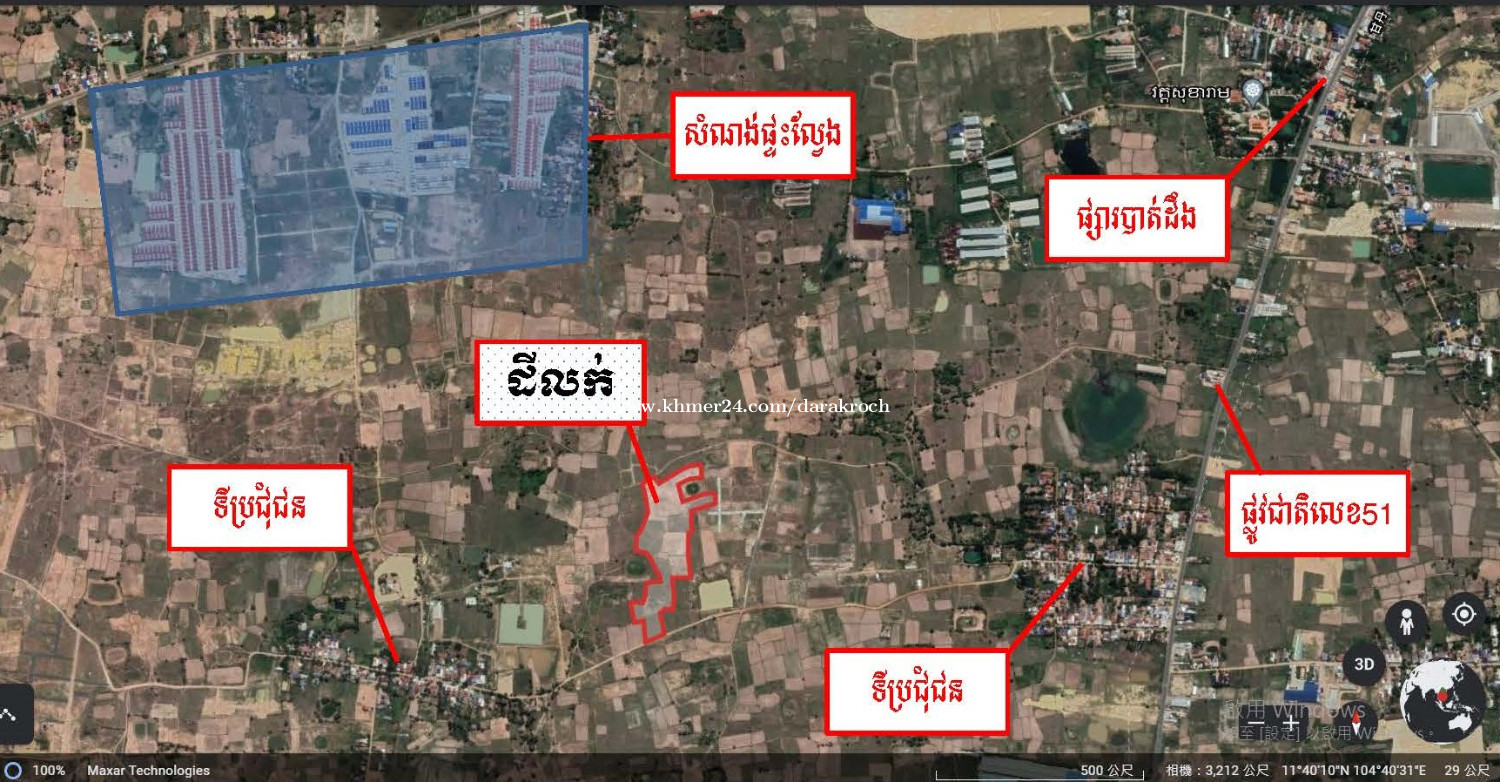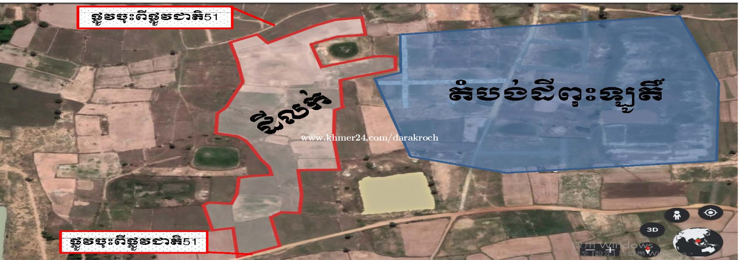 💎ជាតំបន់ដែលមានសក្តានុពលខ្លាំងកំពុងអភិវឌ្ឍ 💎ឋិតនៅទីប្រជុំជន អាចពុះឡូតិ៍ឬសង់ផ្ទះល្វែងលក់ក៏បាន 🛣 ចុះពីផ្លូវជាតិលេខ51 ១គីឡូម៉ែត្រ 💖មានផ្លូវខ្វាត់ខ្វែង ក្បាលដីសងខាងនៅជាប់ផ្លូវ 🔅នៅជាប់នឹងដីពុះឡូតិ៍លក់ 💵 តម្លៃ 25$ /1ម៉ែត្រការ៉េ(ពីមុន36$)