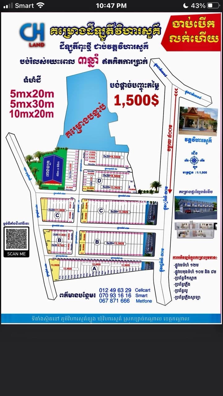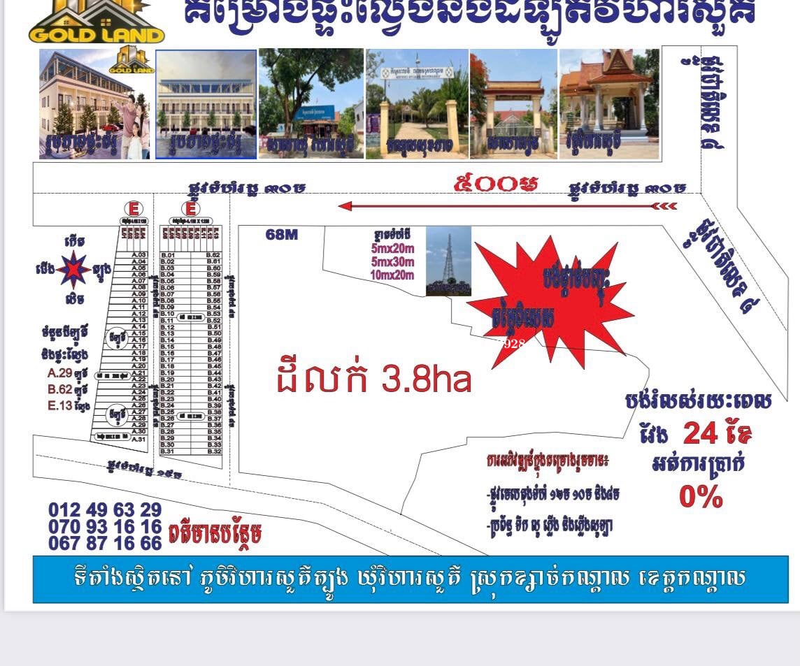 មានដីលក់ទំហំ3.8ha និង ដីឡូតិ៍ដែលមានទំហំ A.29ឡូតិ៍ 5m X 19m - 5m X 30m B.62ឡូតិ៍ 5m X 20m E.13ឡូតិ៍ 4.2m x 20m – ជិតសាលារៀន – ជិតផ្សារ – ជិតដីអភិវឌ្ឍថ្មី – ផ្លូវធំចូលរួមបានគ្រប់ប្រភេទរថយន្ត – ជិតវត្តអារាម ស្រះទឹក មណ្ឌលសុខភាព ប៉ុស្តិ៍នគរបាល —មានប្លង់រឹង 👉 ល្អសម្រាប់ • សង់ផ្ទះលំនៅដ្ឋាន • សង់បន្ទប់ជួល • ទិញទុកចំណេញ • ការវិនិយោគរយៈពេលខ្លី–វែង តម្លៃអាចចរចារបាន ទំនាក់ទំនងលេខ 015871xxxClick To Call , 012919xxxClick To Call អាចមកទីតាំងផ្ទាល់នៅភូមិវិហារសួគិ៍ត្បូង ឃុំវិហារសួគិ៍ ស្រុកខ្សាច់កណ្តាល ខេត្តកណ្តាល