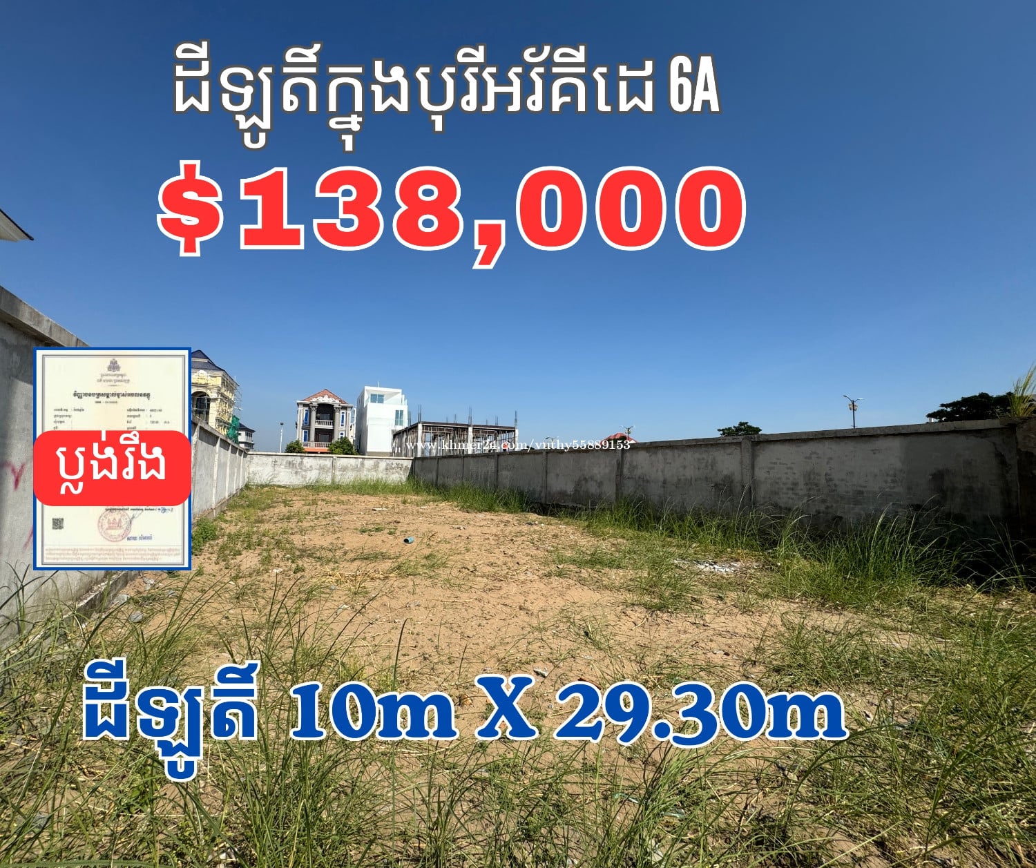 ដីឡូតិ៍ ក្នុងបុរីអរ័គីដេ 6A ក្បាល 10m ជំរៅវែង 29.30m , ជាប់ដីកែង លើផ្លូវមេ
