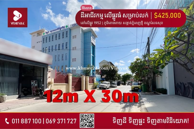 ដីអាជីវកម្ម នៅលើផ្លូវធំ សម្រាប់លក់ !! 📍 ទីតាំង ៖ នៅលើផ្លូវ 1952 | ភូមិពោងពាយ សង្កាត់ភ្នំពេញថ្មី ខណ្ឌសែនសុខ - តម្លៃ ៖ $425,000 (ចរចា) - ទំហំ ៖ 12m X 30m - ផ្លូវទំហំ 12 ម៉ែត្រ - ប្លង់រឹង L-Map - បែរទិសជើង