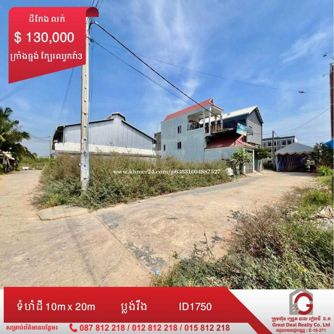 📣📣 ដី ត្រូវការលក់បន្ទាន់ 📍 ទីតាំង: ក្បែរឈូកវ៉ា៣ 💲តម្លៃថ្មី: 130,000$ (ចរចា) ▶️ទំហំដី: 10m x 20m ☎️សម្រាប់ព័ត៌មានបន្ថែម៖ 012812xxxClick To Call/ 015812xxxClick To Call/ 087812xxxClick To Call PropertyID1750