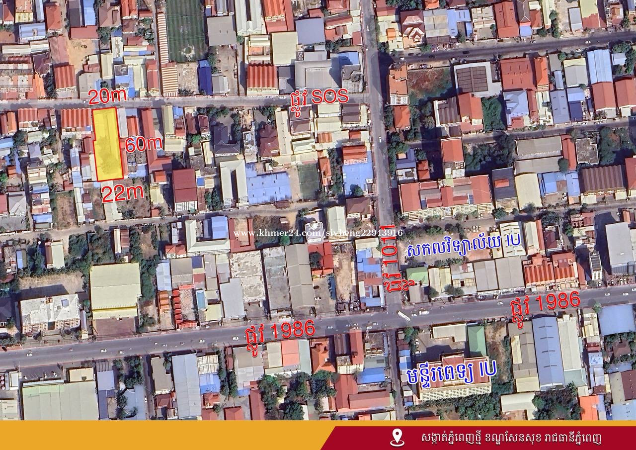 ដីទំហំ 20m x 60m ក្រោយ22m (1260m2) មានបន្ទប់ជួល 36បន្ទប់ ចំនូលប្រចាំខែ 2,000$ ទីតាំង ផ្លូវ SOS សង្កាត់ភ្នំពេញថ្មី ខណ្ឌសែនសុខ ភ្នំពេញ ជិតសាកលវិទ្យាល័យ IU សែនសុខ