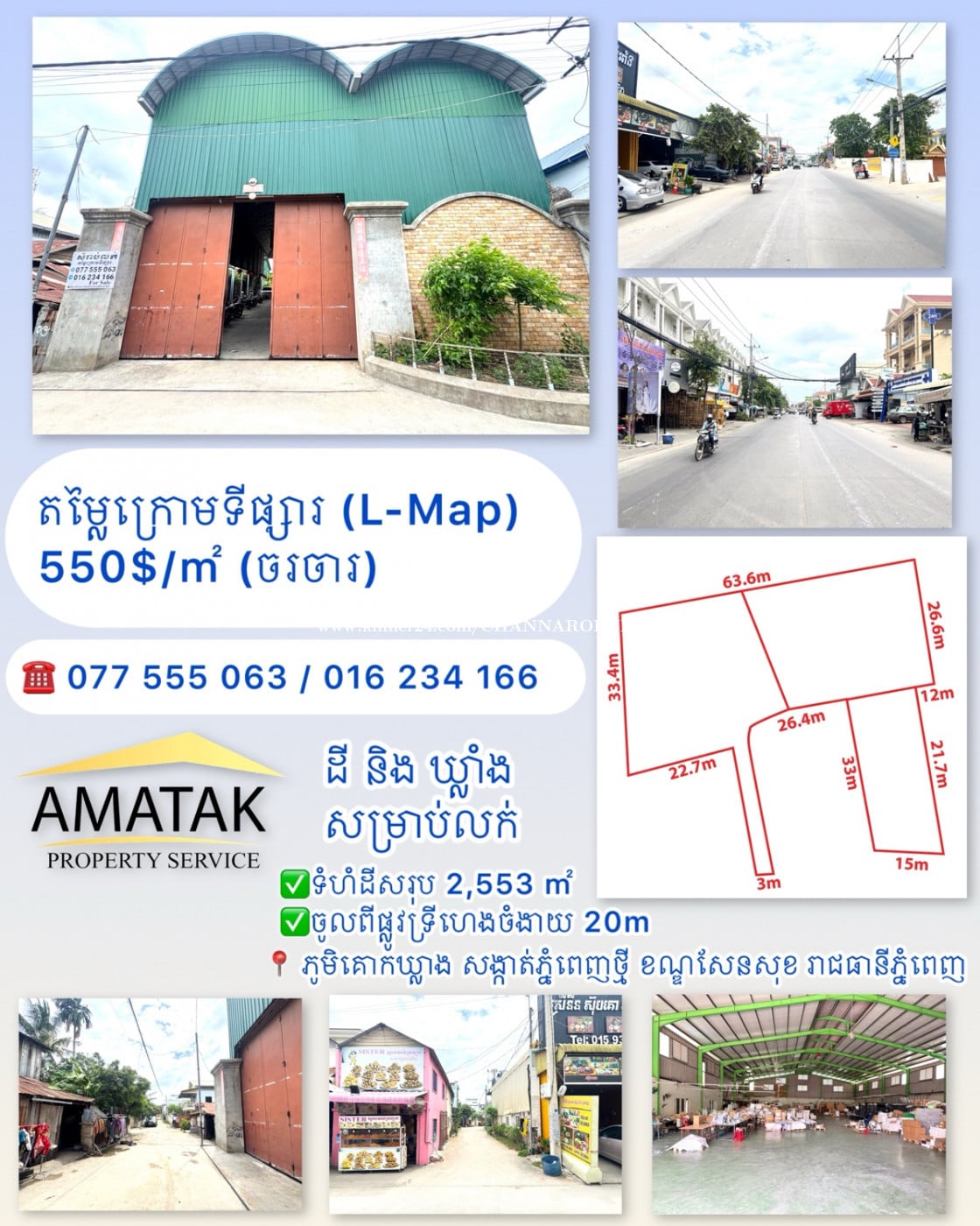 ដី និង ឃ្លាំង សម្រាប់លក់តម្លៃក្រោមទីផ្សារ 550$/m2 (ចរចារ) 📍ភូមិគោកឃ្លាង សង្កាត់ភ្នំពេញថ្មី ខណ្ឌសែនសុខ រាជធានីភ្នំពេញ ✅ប្រភេទដីលំនៅឋាន ✅ទំហំដីសរុប 2,553 ㎡ ✅តម្លៃ 550$/㎡ (ចរចារ) ✅ចូលពីផ្លូវទ្រីហេងចំងាយ 20m ⭐️ទីតាំងល្អ នៅក្បែរទីប្រជុំជន អាចសង់អាគារ ការយាល័យ ខុនដូរ -ល- 👉ផ្ទេរប្លង់កម្មសិទ្ធ L-Map ជូន ✨លេខអាជ្ញាប័ណ្ណក្រុមហ៊ុនE-15-197 ✨ សំរាប់ព័ត៌មានបន្ថែម៖ / Contact info : 📞 077555xxxClick To Call / 016234xxxClick To Call 📱 Telegram : https://t.me/Channaroeun 📱WeChat: 077555xxxClick To Call 📱Chanel Telegram: https://t.me/buysellrentexchangeproperty