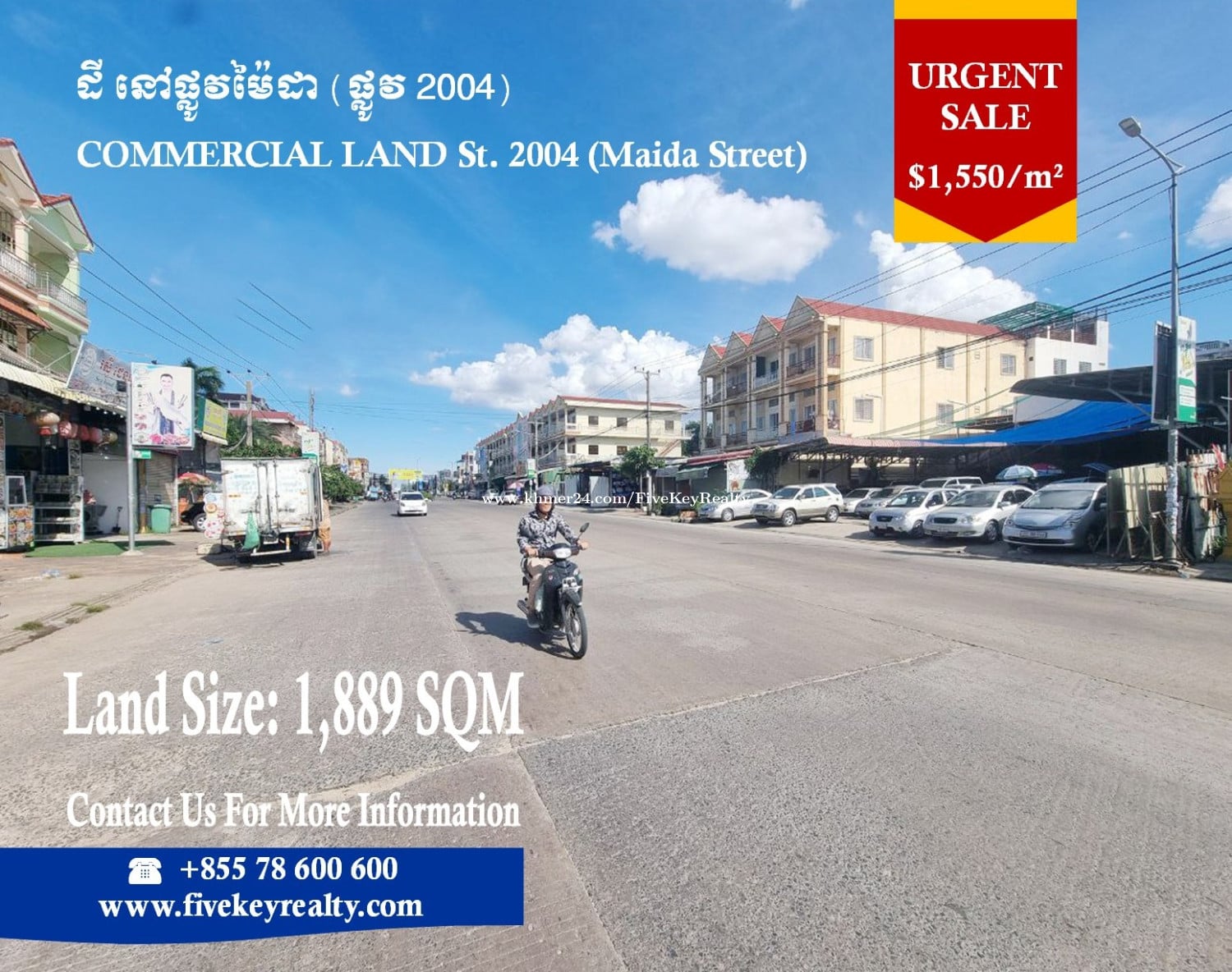 ដី លក់បន្ទាន់ នៅផ្លូវ2004 (ផ្លូវម៉ៃដា) | Land For Urgent Sale on Street 2004 (Maida Street) ■ តម្លៃពិសេស: $1,550/sqm negotiable ■ ទំហំដី: 1,889 SQM (ប្លង់រឹង) ■ ដីមានផ្លួវ 2 (ផ្លូវមុខ-ក្រោយ) ក្បាលដីជាប់ផ្លូវ 2004 (ផ្លូវម៉ៃដា) កន្ទុយជាប់ផ្លូវបេតុង ទីតាំងស្ថិតនៅផ្លូវធំទូលាយ ល្អឥតខ្ចោះសំរាប់ ភោជនីយដ្ឋាន បន្ទប់តាំងបង្ហាញ សាលារៀន មន្ទីពេទ្យ ហ្គារាសឡាន និងគ្រប់សកម្មភាពអាជីវកម្ម។ ≈≈≈≈≈≈≈≈≈≈≈≈≈≈≈≈≈ ■ Special Price: $1,550/sqm negotiable ■ Land size: 1,889 SQM (L-Map) ■ Land with 2 roads (front-back road) The frontage along the road 2004 (Maida Road), tail next to the concrete road, located on a wide road, is perfect for restaurants, showrooms, schools, hospitals, garages, and all business activities. ទាក់ទងមកយើងឥឡូវនេះ! | Contact Us Now! សម្រាប់ព័ត៌មានលម្អិត | For Details: ☎️ Tel: +8557860xxxClick To Call0 (Telegram/LINE/WhatsApp/Wechat) 🌐 More properties: www.fivekeyrealty.com ≈≈≈≈≈≈≈≈≈≈≈≈≈≈≈≈≈ ដើម្បីទទួលបាន ព័ត៌មានអចលនទ្រព្យ ល្អៗ តម្លៃល្អៗ តម្លៃលក់បន្ទាន់ សូមចូលទៅកាន់ CHANNEL តេលេក្រាម Join US: https://t.me/joinchat/PDAU5_OLzE5iNDk1 លោកអ្នក នឹងទទួលបានព័ត៌មានល្អៗ អំពីតំលៃអចលនវត្ថុទូទាំងប្រទេសកម្ពុជា ។
