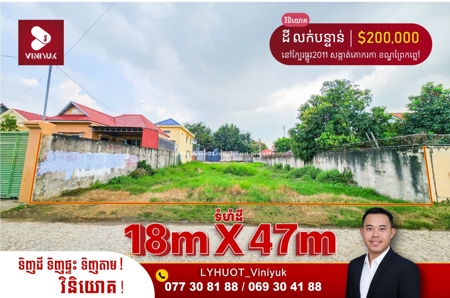 🏡ដី លក់បន្ទាន់ !! តំលៃលក់ពិសេសជាងគេក្នុងតំបន់ 📍ទីតាំង ៖ នៅម្តុំបុរីមេគង្គអ៊ែតវ័នញូ ភូមិខ្មែរលើ សង្កាត់គោករកា ខណ្ឌព្រែកព្នៅ - តម្លៃ ៖ $200,000 (ចរចា) - ទំហំ ៖ 18m X 47m (ក្នុងប្លង់រឹង760ម៉ែត្រការ៉េ) - ទីតាំងល្អខ្លាំងណាស់ មានផ្លូវមុខក្រោយ ,ស្ថិតក្នុងទីប្រជុំជន - កាត់ប្លង់រឹងជូន - ផ្លូវមុខដីទំហំ 5ម៉ែត្រ - លេខអាជ្ញាប័ណ្ណ : E-22-404 📲សូមធ្វើការទំនាក់ទំនង ៖ 069304xxxClick To Call 077308xxxClick To Call > https://t.me/lyhuot_property ----------------------------------------