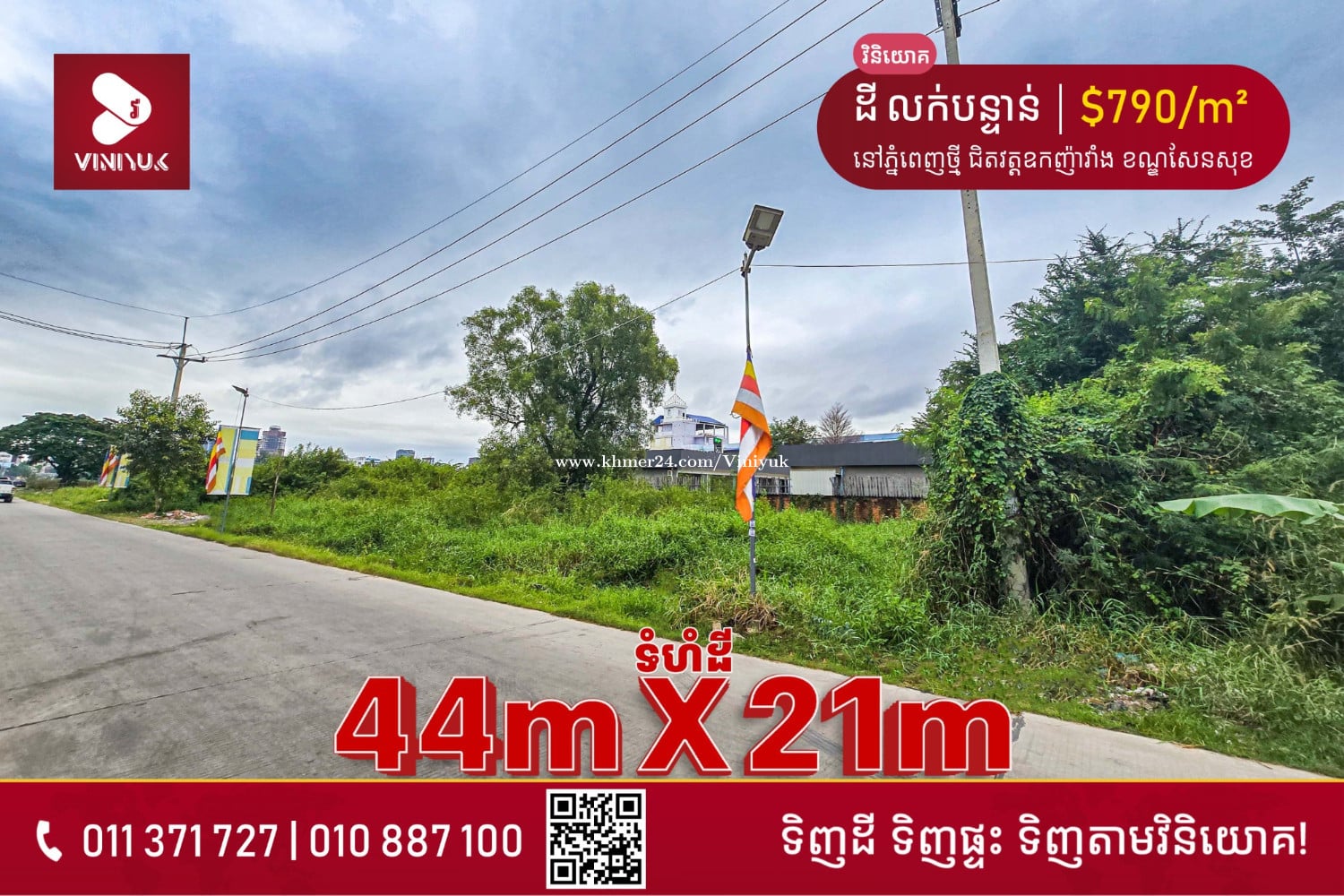 🏡ដី លក់បន្ទាន់ !! 📍ទីតាំង ៖ នៅជិតវត្តឧកញ៉ាវាំង សង្កាត់ភ្នំពេញថ្មី ខណ្ឌសែនសុខ រាជធានីភ្នំពេញ - តម្លៃលក់ : $790/m² ចរចា - ទំហំដី : 44m x 21m - ទំហំ សរុបក្នុងប្លង់រឹង (964m²) - ប្លង់ រឹង - ទិស ជើង - លេខអាជ្ញាប័ណ្ណ : E-22-404