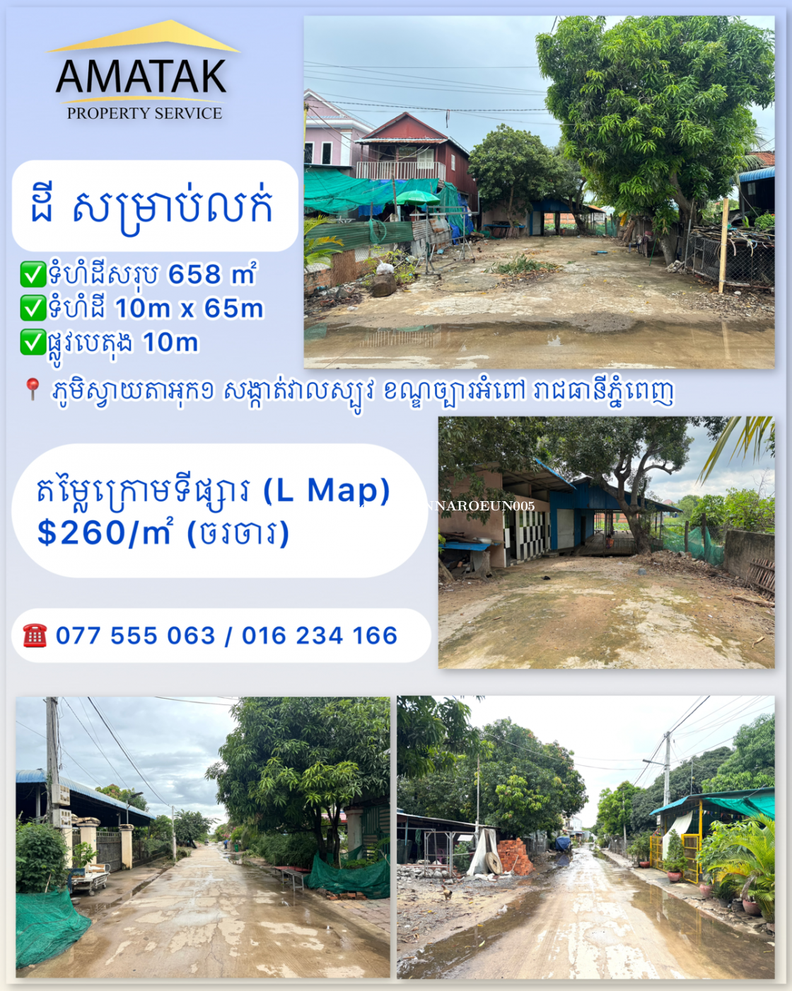 ដី សម្រាប់លក់តម្លៃក្រោមទីផ្សារ 260$/㎡ (ចរចារ) 📍ភូមិស្វាយតាអុក១ សង្កាត់វាលស្បូវ ខណ្ឌច្បារអំពៅ រាជធានីភ្នំពេញ។ ✅ ប្រភេទដីលំនៅឋាន ✅ទំហំដីសរុប 658㎡ ✅ទំហំដី 10m x 65m ✅តម្លៃ 260$/㎡ (ចរចារ) ✅ផ្លូវចូលបេតុង 10m ⭐️ទីតាំងល្អ នៅក្បែរទីប្រជុំជន សង់ផ្ទះលំហែល -ល- 👉ផ្ទេរប្លង់កម្មសិទ្ធ L-Map ជូន ✨លេខអាជ្ញាប័ណ្ណក្រុមហ៊ុនE-15-197 ✨ សំរាប់ព័ត៌មានបន្ថែម៖ / Contact info : 📞 077555xxxClick To Call / 016234xxxClick To Call 📱 Telegram : https://t.me/Channaroeun