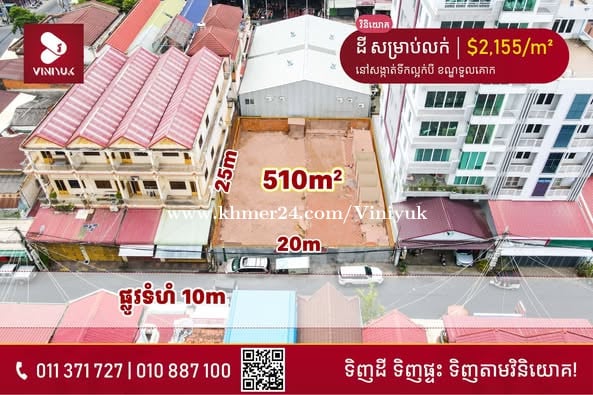 ដី សម្រាប់លក់/ជួល !! 📍ទីតាំង ៖ នៅសង្កាត់ទឹកល្អក់បី ខណ្ឌទួលគោក - តម្លៃ ៖ $2,155/m² (ចរចាបាន) - តម្លៃ ជួល៖ $1,600/ខែ (ចរចាបាន) - ទំហំដី ៖ 20m x 25m (ទំហំក្នុងប្លង់510ម៉ែត្រការ៉េ) - កាត់ប្លង់រឹងជូន - ផ្លូវមុខដី 10ម៉ែត្រ - លេខអាជ្ញាប័ណ្ណ : E-22-404