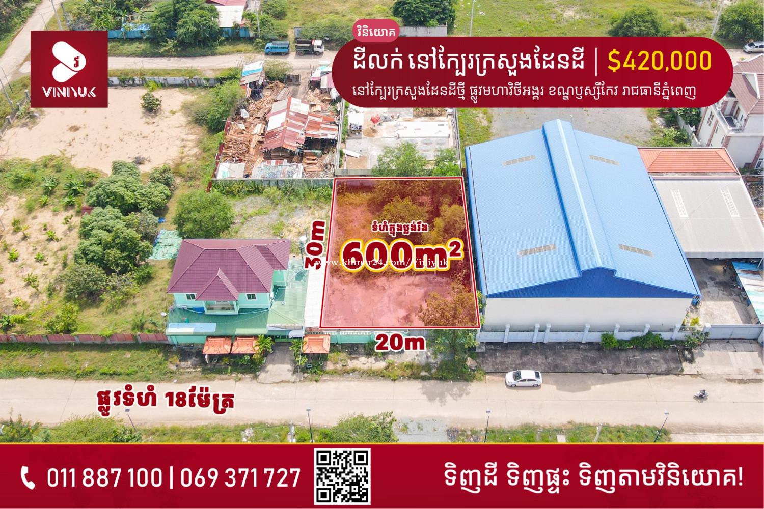 🏡ដី សម្រាប់លក់ !! 📍ទីតាំង ៖ នៅក្បែរក្រសួងដែនដីថ្មី ផ្លូវមហាវិថីអង្គរ ខណ្ឌឫស្សីកែវ រាជធានីភ្នំពេញ - តម្លៃលក់ ៖ $420,000 ចរចា - ទំហំដី ៖ 20m X 30m (ក្នុងប្លង់រឹង600ម៉ែត្រការ៉េ) - បែរទិសខាងជើង - កាត់ប្លង់រឹងជូន - ផ្លូវទំហំ18ម៉ែត្រ - លេខអាជ្ញាប័ណ្ណ : E-22-404 📲សូមធ្វើការទំនាក់ទំនង ៖ 011887xxxClick To Call | 010887xxxClick To Call 011371xxxClick To Call | 069371xxxClick To Call