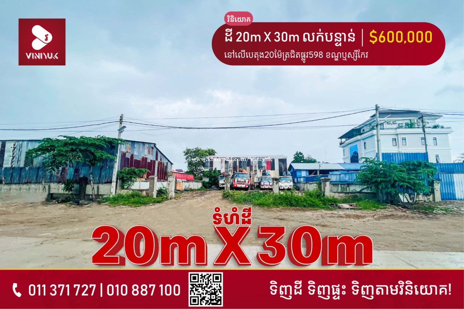 ដី សម្រាប់លក់!! 📍ទីតាំង ៖ នៅលើបេតុង20ម៉ែត្រជិតផ្លូវ598 ខណ្ឌឬស្សីកែវ - តម្លៃលក់ : $600,000 ចរចា - ទំហំដី៖ 20m x 30m - ផ្លូវមុខដី 20ម៉ែត្រ - ប្លង់រឹង - លេខអាជ្ញាប័ណ្ណ : E-22-404