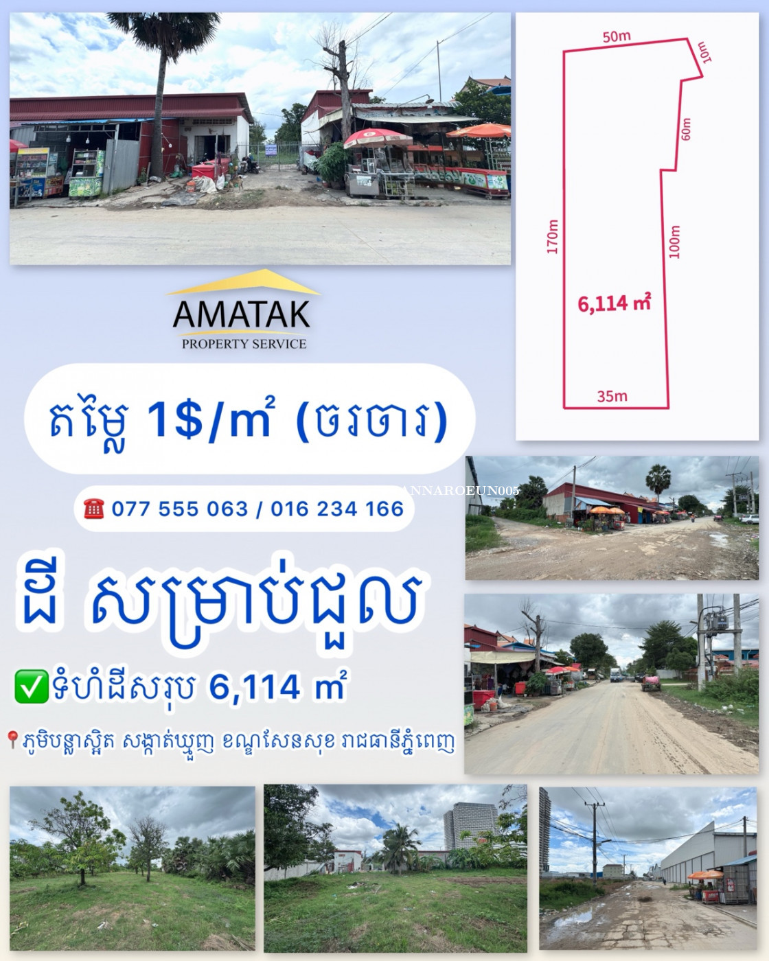 ដី សម្រាប់ជួល 📍ភូមិបន្លាស្អិត សង្កាត់ឃ្មួញ ខណ្ឌសែនសុខ រាជធានីភ្នំពេញ ✅ទំហំដីសរុប 6,114 ㎡ ✅តម្លៃ 1$/㎡ (ចរចារ) ✅ដីកែងផ្លូវ2 ក្បាលដី35m ⭐️ទីតាំងល្អ នៅក្បែរទីប្រជុំជន អាចសង់អាគារ ការយាល័យ ខុនដូរ -ល- ✨លេខអាជ្ញាប័ណ្ណក្រុមហ៊ុនE-15-197 ✨ សំរាប់ព័ត៌មានបន្ថែម៖ / Contact info : 📞 077555xxxClick To Call / 016234xxxClick To Call 📱 Telegram : https://t.me/Channaroeun