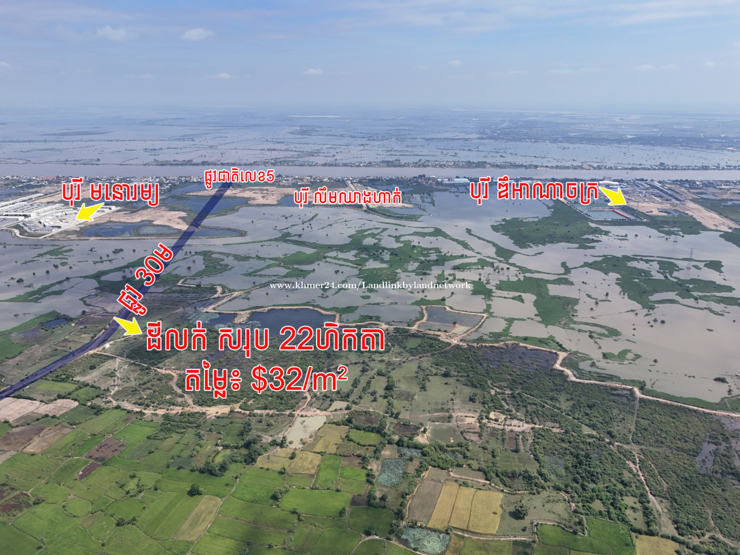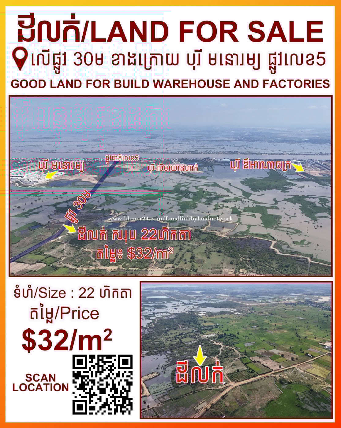 ✅ដីកែងលក់ តម្លៃក្រោមទីផ្សារ 📍ទីតាំង៖ ជិតបុរី មនោរម្យ ព្រែកតាទែន ផ្លូវជាតិលេខ5, លើផ្លូវគម្រោង 30ម 📐ទំហំសរុប៖ 226,779 ម៉ែត្រការ៉េ (22ហិកតា) 💵តម្លៃ៖ $32/ម៉ែត្រការ៉េ 🎯ទីតាំងល្អ សម្រាប់ ធ្វើឃ្លាំង រោងក្រ ឬ ទិញទុកចំណេញ, ស្ថិតក្នុងតំបន់អភិវឌ្ឍន បឹងតាមោក 📲ទំនាក់ទំនងពត៌មានបន្ថែម៖ 077975xxxClick To Call ————- ✅Land for SALE Urgent 📍Location : Near Borey Monorom NR5 📐Total size: 22 Hectars 💵Price : $32/m2 (Under Market Price) 🎯Good for build warehouse, factories or land banking 📲Contact for more info: 077975xxxClick To Call 📍Location link: https://maps.app.goo.gl/9ZQ1XmZkd6djo5H99?g_st=ipc