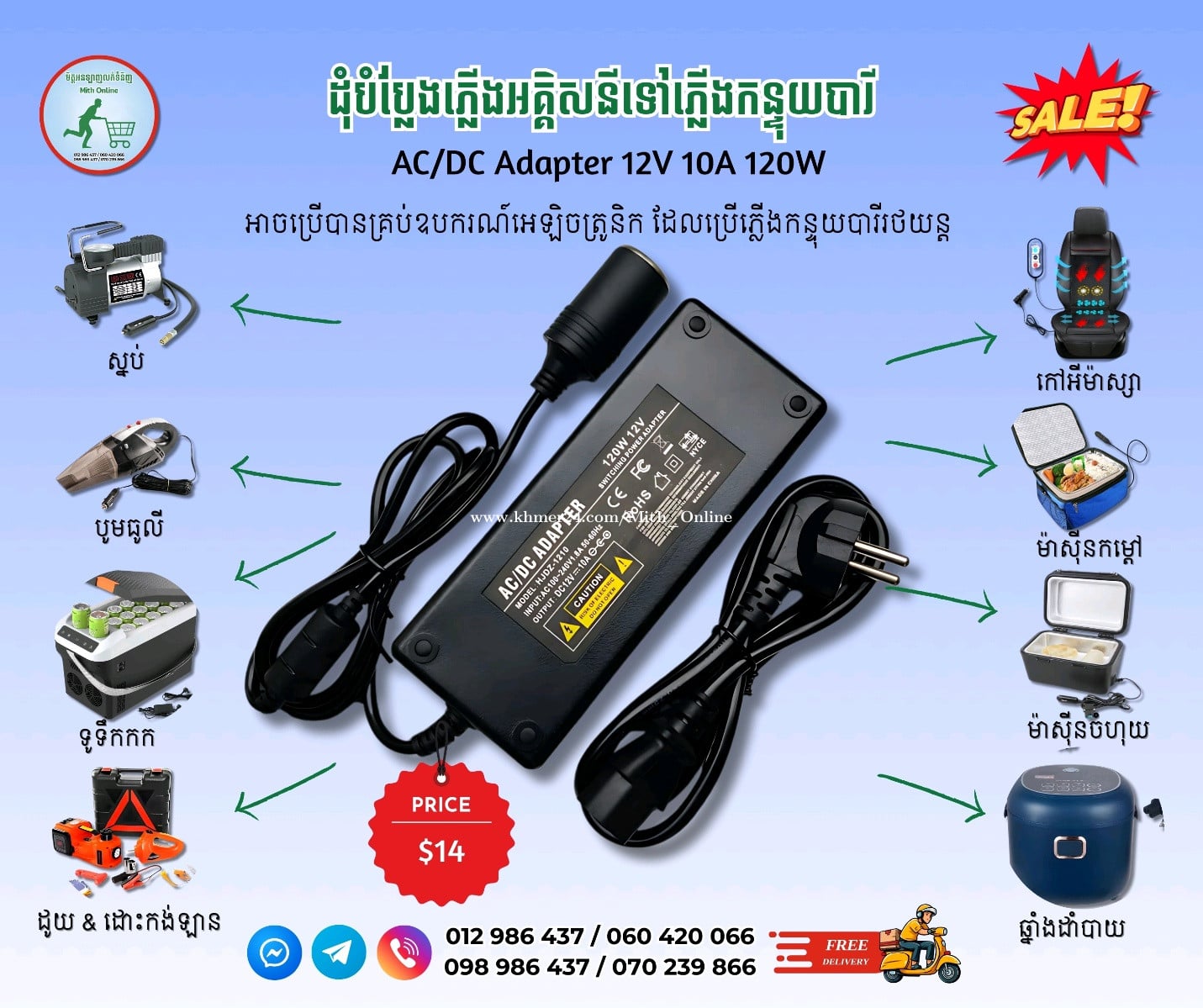🔌ដុំបំប្លែងភ្លើងអគ្គិសនីទៅភ្លើងកន្ទុយបារី 🔌AC/DC Adapter 12V 10A 120W 👉យកភ្លើងអគ្គិសនី (ភ្លើងតាមផ្ទះ) មកប្រើជាមួយឧបករណ៍ប្រើប្រាស់ក្នុងយានយន្ត ដូចជា៖ ស្នប់ ម៉ាស៊ីនបូមធូលី ទូទឹកកក ឆ្នាំងដាំបាយ ឆ្នាំងចម្អិនសាច់ កៅអីម៉ាស្សា ឧបរករណ៍ដូយ និងដោះកង់ឡាន។ល។ 👉Converting electricity power at home to be used with car air pumps, car vaccum cleaners, car refrigerators, car cookers, car ovens, car massage seats, etc. 💰តម្លៃ $14/unit 📦ដឹកជញ្ជូនឥតគិតថ្លៃ Free Delivery ☎️012986xxxClick To Call / 060420xxxClick To Call ☎️098986xxxClick To Call / 070239xxxClick To Call