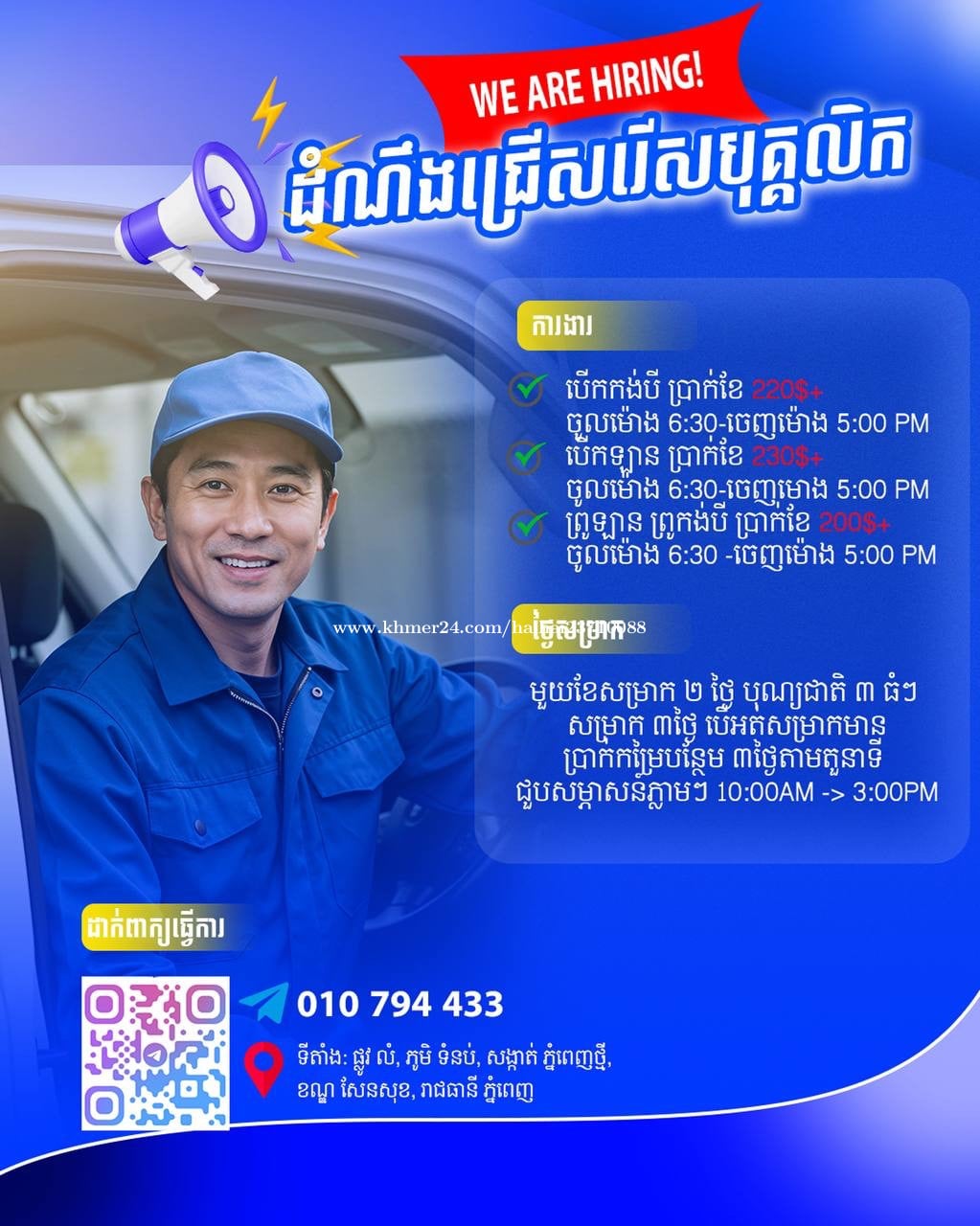 ដំណឹងជ្រើសរើសបុគ្គលិក 1. បើកកង់បី ប្រាក់ខែ 220$+ ចូលម៉ោង 6:30 AM ចេញម៉ោង 5:00 PM 2. បើកឡាន ប្រាក់ខែ 230$+ ចូលម៉ោង 6:30 AM ចេញមោង 5:00 PM 3. ព្រូឡាន ព្រូកង់បី ប្រាក់ខែ 200$+ ចូលម៉ោង 6:30 AM ចេញម៉ោង 5:00 PM មួយខែសម្រាក ២ ថ្ងៃ បុណ្យជាតិ ៣ ធំៗ សម្រាក ៣ថ្ងៃ បើអត់សម្រាកមានប្រាក់កម្រៃបន្ថែម ៣ថ្ងៃតាមតួនាទី ជួបសម្ភាសន៍ភ្លាមៗ 10:00AM -> 3:00PM