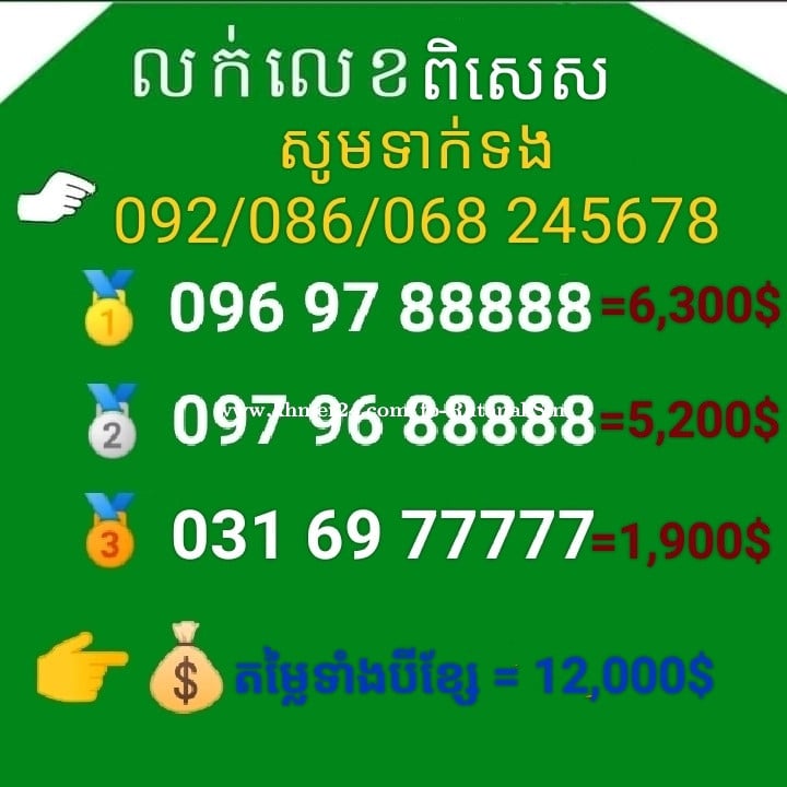 VIP Number For Sale 👇 096 97 88888: 5,300$ 097 96 88888: 5,200$ 031 69 77777: 1,900$ 067 30 6666 : 618$ Sold 3 Numbers price only 12,000$ if you interested, please kindly contact me 092245678. Thanks