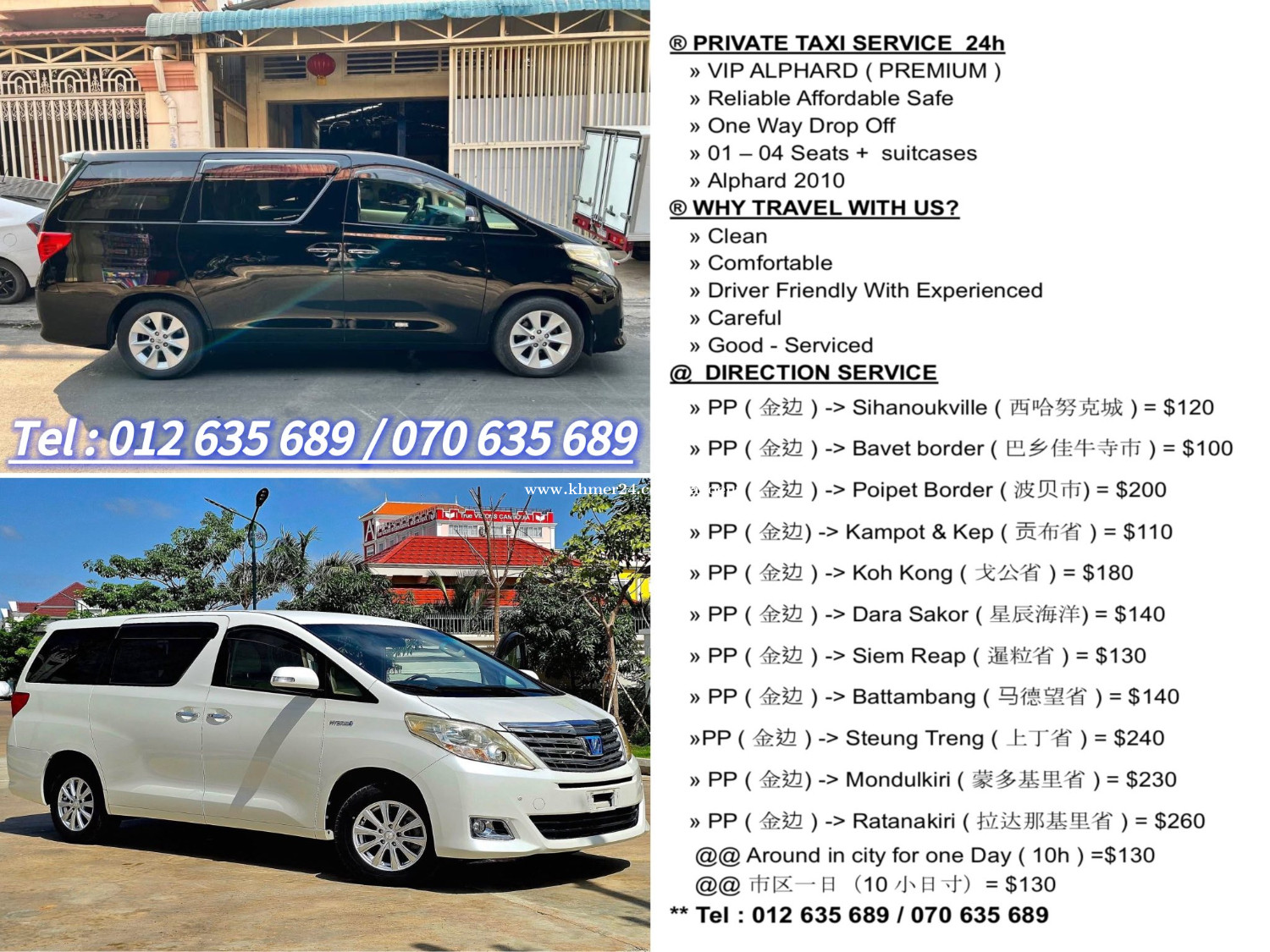 Private Taxi For Rent 25 Province and City + VIP ALPHARD ( Premium ) + SUV + Mini Starex + Pruis Tel : 078235xxxClick To Call /067636xxxClick To Call