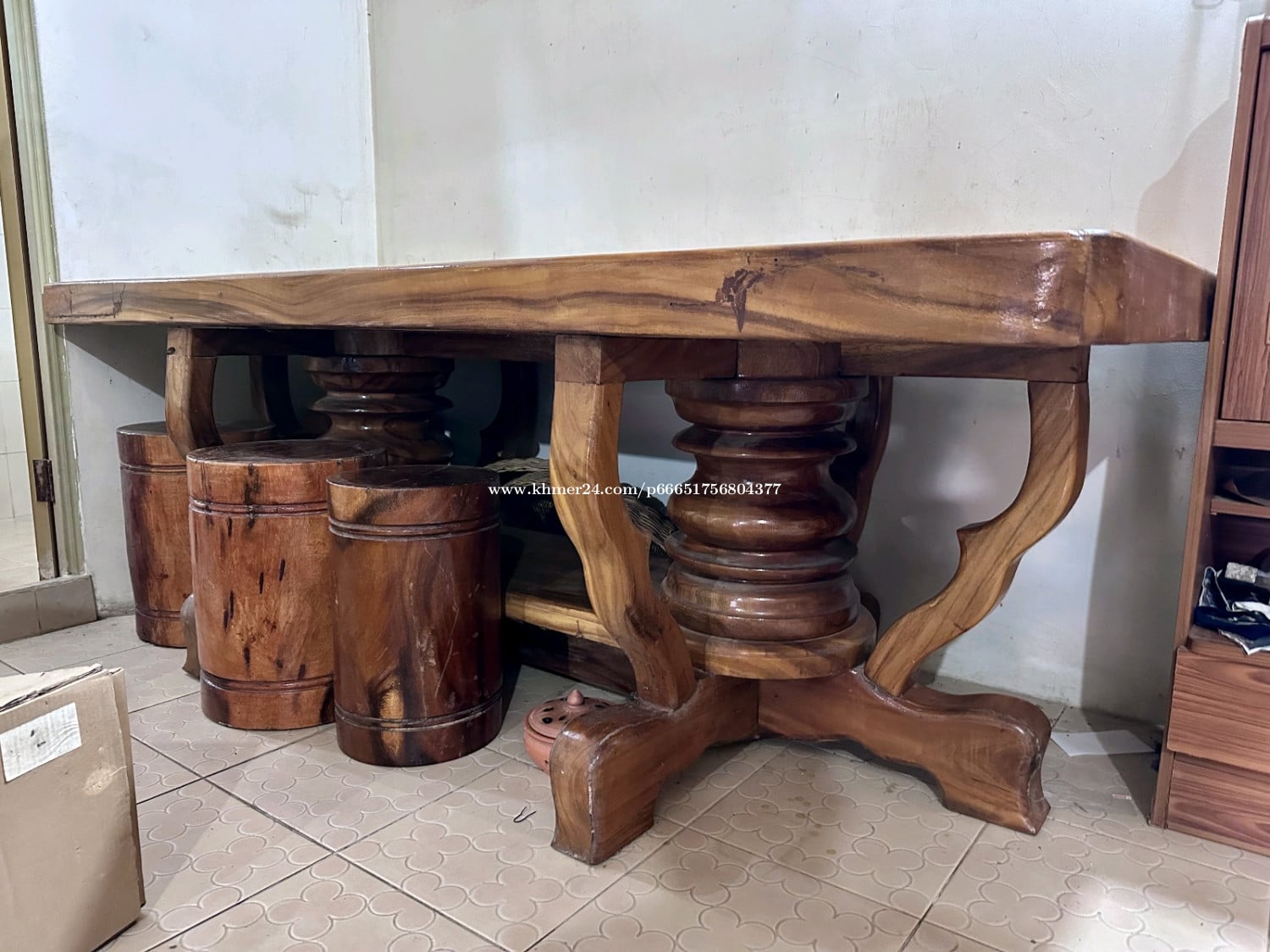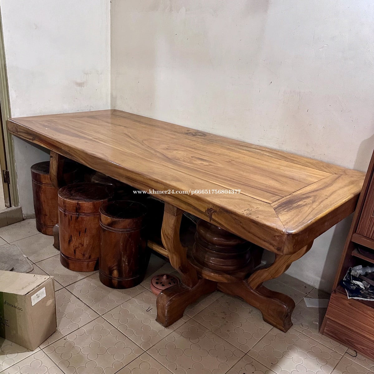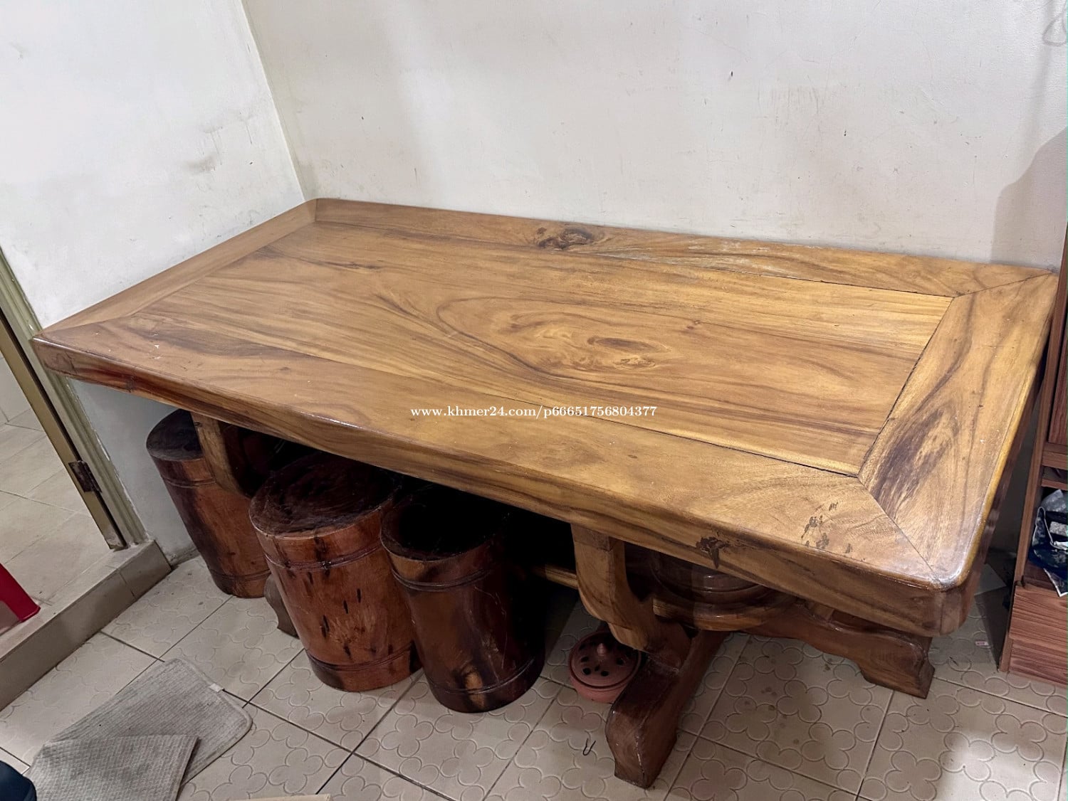 តុបាយឈើធំមាំ ជើងទ្រក្រឡឹងស្អាតភ្លឹង ទំហំ 2.15m x 0.95m កំពស់ 0.77m ល្មម ស្រួលប្រើតកូនចៅ តុនេះជាតុកេរ្តប៉ា តែដោយសារផ្ទះតូចពេកទើបលក់ចេញ