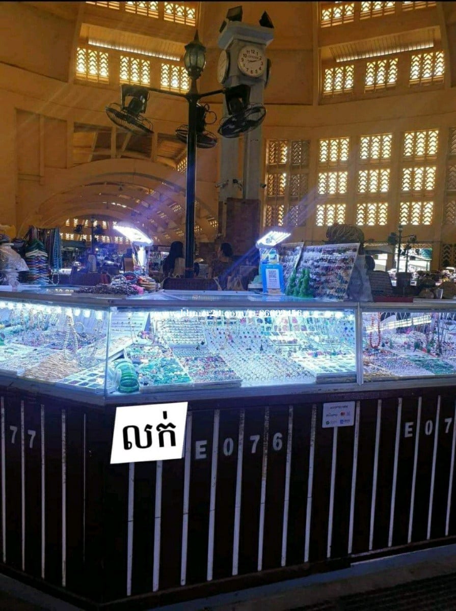 តូបលក់ E076 គ្រឿងអលង្ការផ្សារធំថ្មី ទីតាំង ចំកណ្ដាលក្រុង មានភ្ញៀវទេសចរណ៍ជាតិ និងអន្តរជាតិមកទស្សនារៀងរាល់ថ្ងៃ ផ្លូវចូលពីខាងជើងផ្សារ (តម្លៃចចាអរគុណ )