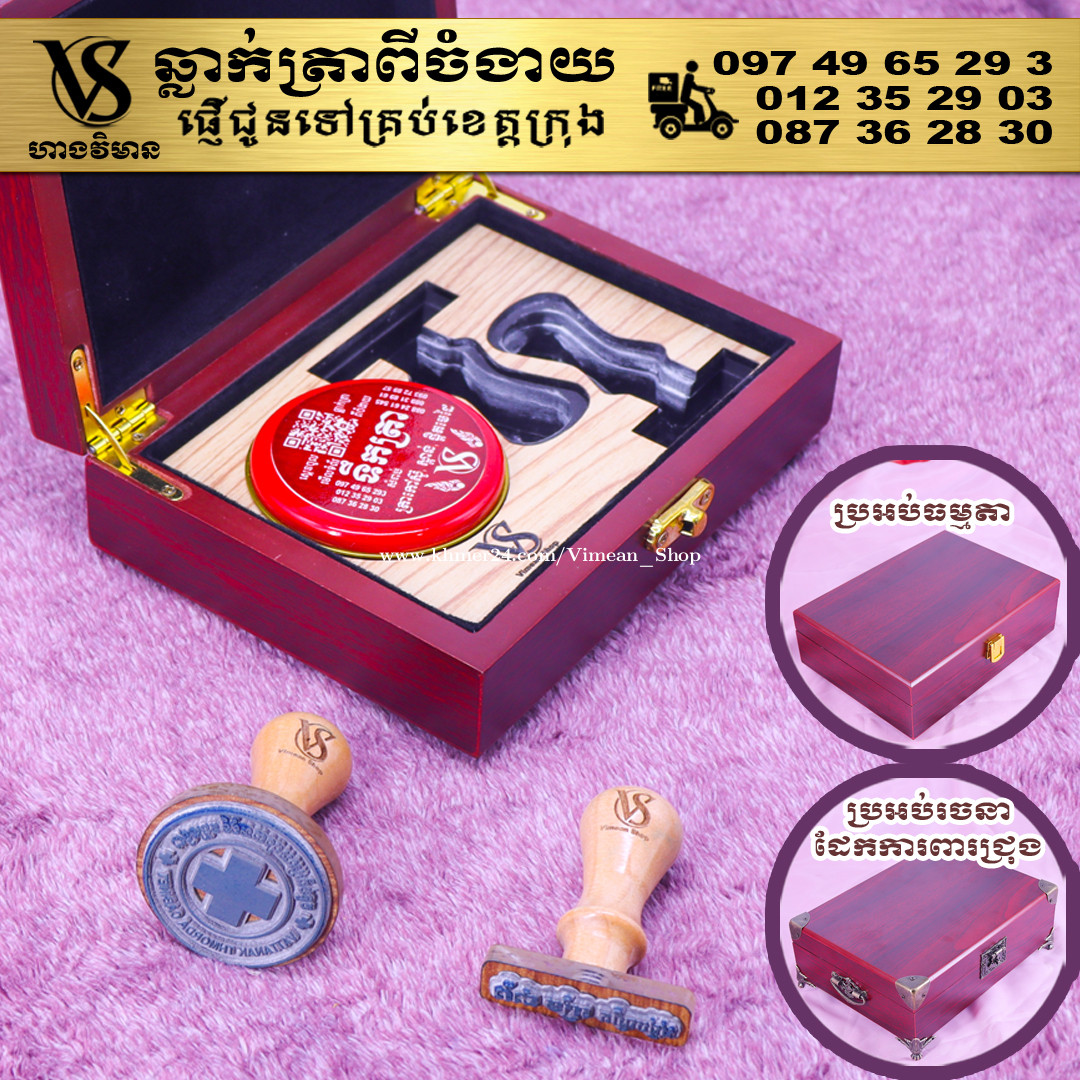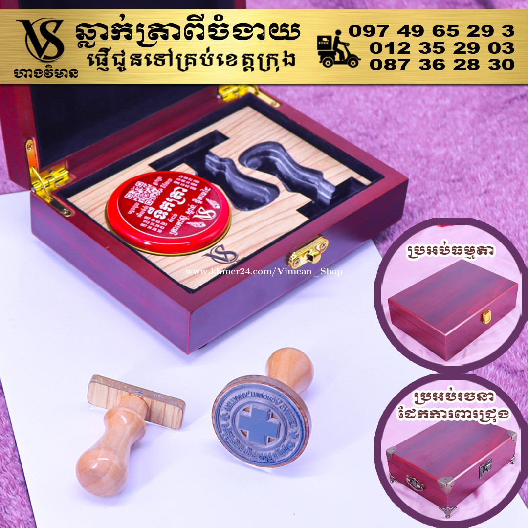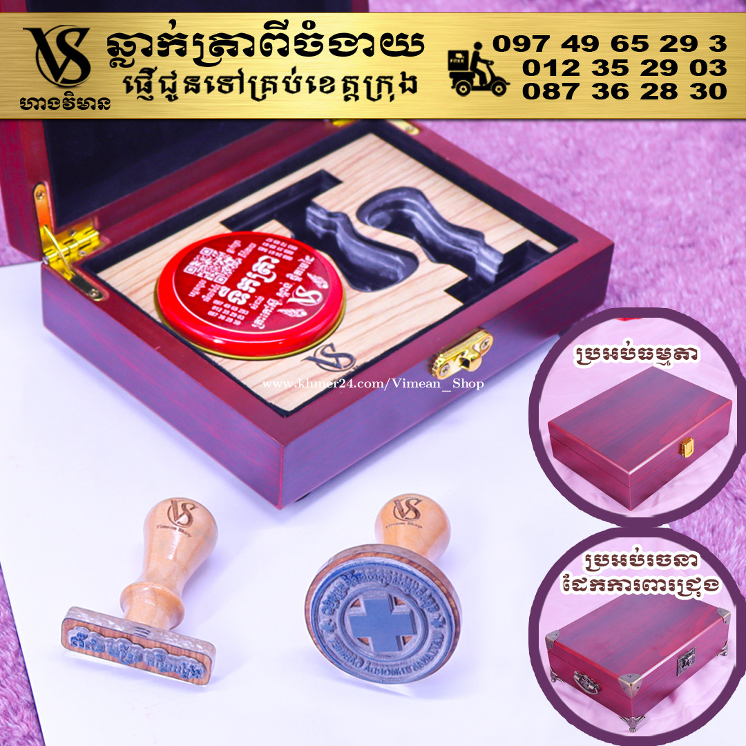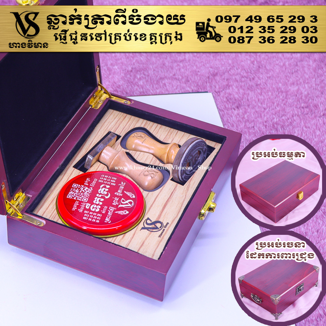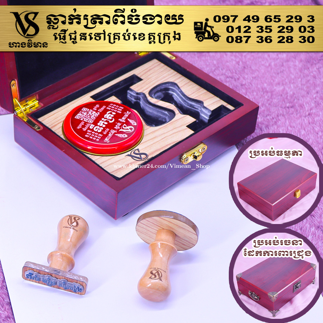 ពេលត្រូវការបោះត្រាម្តងៗ ពិបាករកត្រាមែនទេ? ដោយសារវានៅរប៉ាត់រប៉ាយ ជូនកាលរកត្រាឃើញ តែបាត់តាំប៉ុងមែនទេ? ឆ្លាក់ត្រាមួយឈុត មានប្រអប់ទុកដាក់ត្រានិងតាំប៉ុង។ ទាញមកគឺបោះត្រាបានតែម្តង។ ឈុតត្រាដ៏ប្រណិតនេះរចនាឡើងយ៉ាងសាមញ្ញ ប៉ុន្តែបំពេញដោយសោភ័ណភាព ទាក់ទាញពេលដាក់លើតុធ្វើការ។ វាមានប្រអប់ឈើស្អាត សមរម្យសម្រាប់តាំង ហើយរួមមានតាំប៉ុងគុណភាពខ្ពស់ សមរម្យសម្រាប់ត្រាកៅស៊ូ និងសាច់ត្រាស្ពាន់ ដែលអាចបោះបានយ៉ាងច្បាស់។ ឆ្លាក់ត្រាពីចំងាយនិងផ្ញើជូនគ្រប់ខេត្តក្រុង សាកសួរឬកុម៉្មង់តាមMessenger៖ http://m.me/stampmaking Tel : 089318xxxClick To Call (Cellcard) / 0882461xxxClick To Call (Metfone) / 093728xxxClick To Call (Smart) ផ្ទះG21 ផ្លូវGoody សង្កាត់ទឹកថ្លា ខណ្ឌសែនសុខ រាជធានីភ្នំពេញ( ក្នុងបូរីនៃផ្សាររតនាផ្លាហ្សា1 ឬ ម្តុំស្ពានអាកាសផ្សារដីហ៊ុយ ) #ត្រាក្រុមហ៊ុន #ត្រាមេធាវី #ត្រាវត្ត