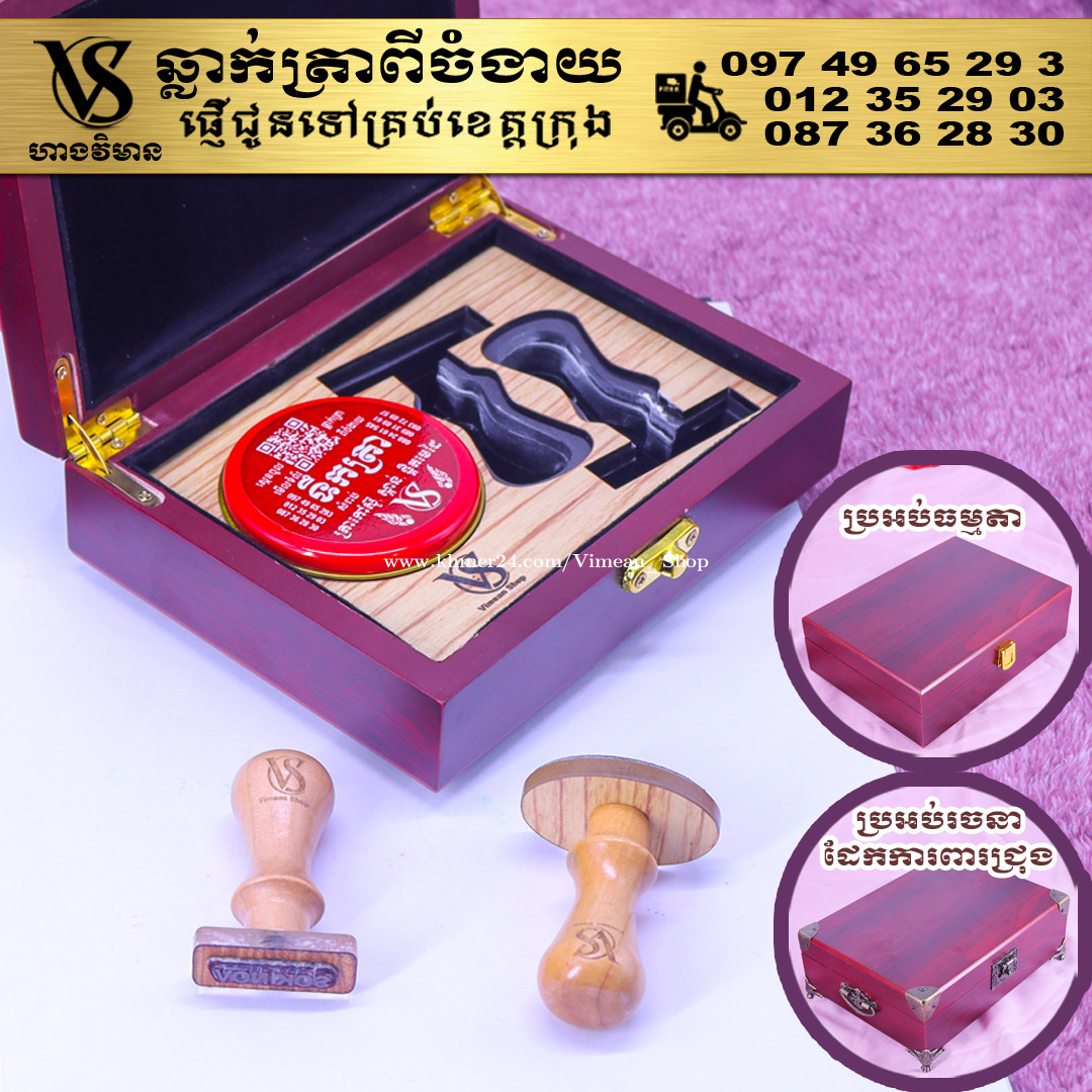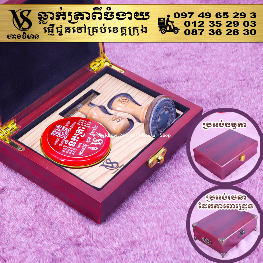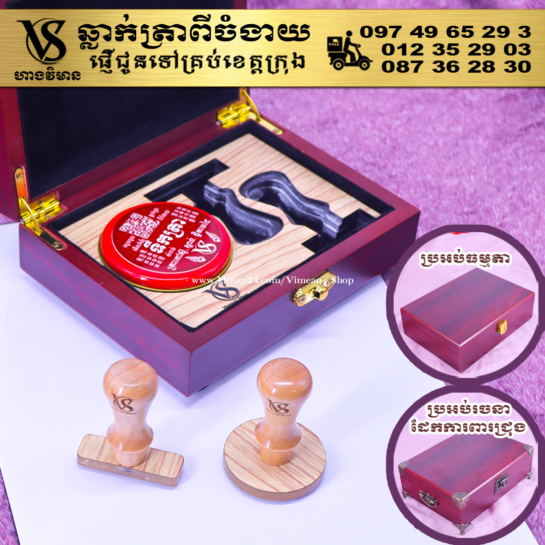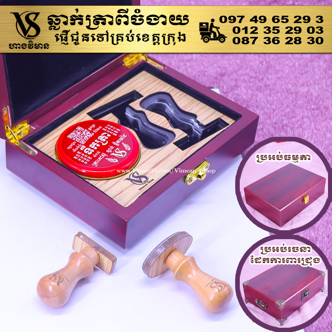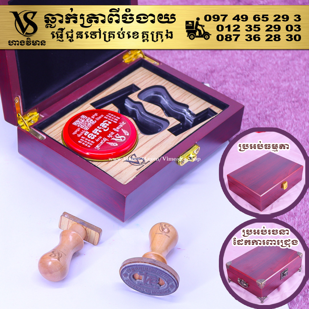ពេលត្រូវការបោះត្រាម្តងៗ ពិបាករកត្រាមែនទេ? ដោយសារវានៅរប៉ាត់រប៉ាយ ជូនកាលរកត្រាឃើញ តែបាត់តាំប៉ុងមែនទេ? ឆ្លាក់ត្រាមួយឈុត មានប្រអប់ទុកដាក់ត្រានិងតាំប៉ុង។ ទាញមកគឺបោះត្រាបានតែម្តង។ ឈុតត្រាដ៏ប្រណិតនេះរចនាឡើងយ៉ាងសាមញ្ញ ប៉ុន្តែបំពេញដោយសោភ័ណភាព ទាក់ទាញពេលដាក់លើតុធ្វើការ។ វាមានប្រអប់ឈើស្អាត សមរម្យសម្រាប់តាំង ហើយរួមមានតាំប៉ុងគុណភាពខ្ពស់ សមរម្យសម្រាប់ត្រាកៅស៊ូ និងសាច់ត្រាស្ពាន់ ដែលអាចបោះបានយ៉ាងច្បាស់។ ឆ្លាក់ត្រាពីចំងាយនិងផ្ញើជូនគ្រប់ខេត្តក្រុង សាកសួរឬកុម៉្មង់តាមMessenger៖ http://m.me/stampmaking Tel : 089318xxxClick To Call (Cellcard) / 0882461xxxClick To Call (Metfone) / 093728xxxClick To Call (Smart) ផ្ទះG21 ផ្លូវGoody សង្កាត់ទឹកថ្លា ខណ្ឌសែនសុខ រាជធានីភ្នំពេញ( ក្នុងបូរីនៃផ្សាររតនាផ្លាហ្សា1 ឬ ម្តុំស្ពានអាកាសផ្សារដីហ៊ុយ ) #ត្រាក្រុមហ៊ុន #ត្រាមេធាវី #ត្រាវត្ត