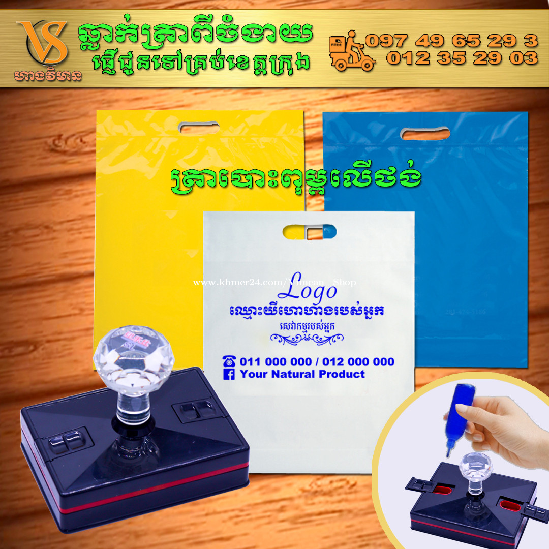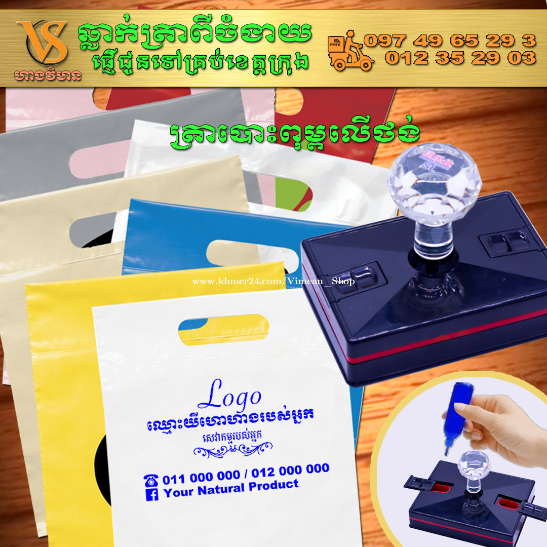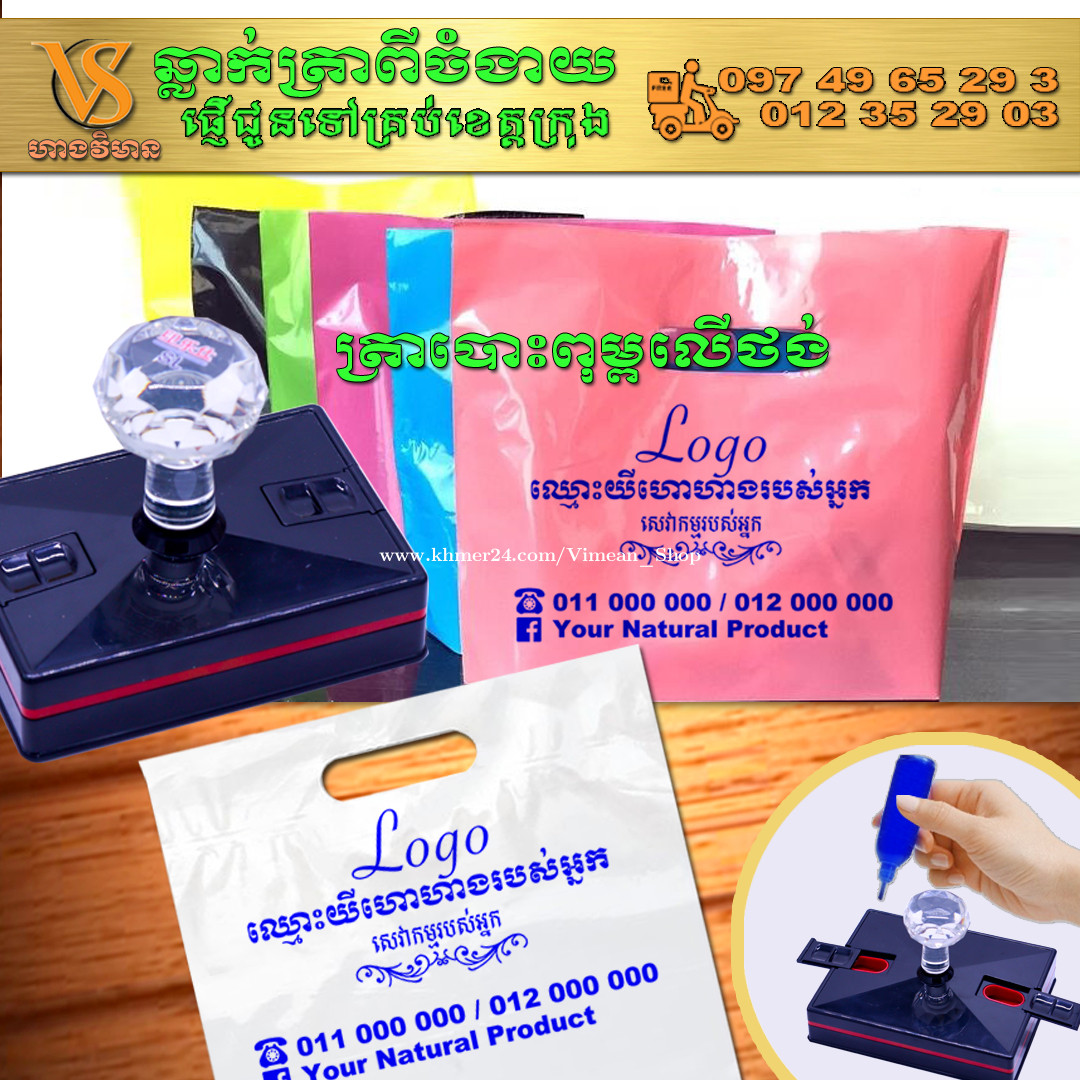 ត្រាសង្កត់លើថង់ប្លាស្ទិច ដើម្បីបោះពុម្ពលើថង់។ សូមទស្សនាវីដេអូ៖ https://www.facebook.com/stampmaking/videos/1094104265243087/ ឆ្លាក់ត្រាពីចំងាយ & ផ្ញើជូនគ្រប់ខេត្តក្រុង។ សាកសួរឬកុម៉្មង់តាម Messenger: http://m.me/stampmaking Tel : 089318xxxClick To Call (Cellcard) / 0882461xxxClick To Call (Metfone) / 093728xxxClick To Call (Smart) Address៖ ផ្ទះ G21, ផ្លូវ Goody, សង្កាត់ទឹកថ្លា, ខណ្ឌសែនសុខ, រាជធានីភ្នំពេញ ( ក្នុងបូរីនៃផ្សាររតនាផ្លាហ្សា1 ឬ ម្តុំស្ពានអាកាសផ្សារដីហ៊ុយ ) ----------------- #plasticbags #logodesigner #printingservices ធ្វើត្រាបោះលើថង់ ត្រាបោះលើថង់ បោះត្រាលើថង់ ផលិតត្រាលើថង់ ឆ្លាក់ត្រាលើថង់ ត្រាថង់ឯកជន ត្រាថង់ក្រុមហ៊ុន ត្រាបោះលើថង់គ្រប់ប្រភេទ ត្រាថង់អត្តសញ្ញាណ សេវាធ្វើត្រាបោះលើថង់