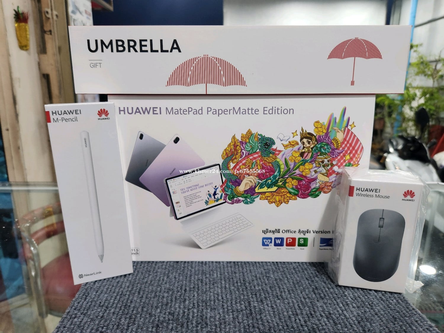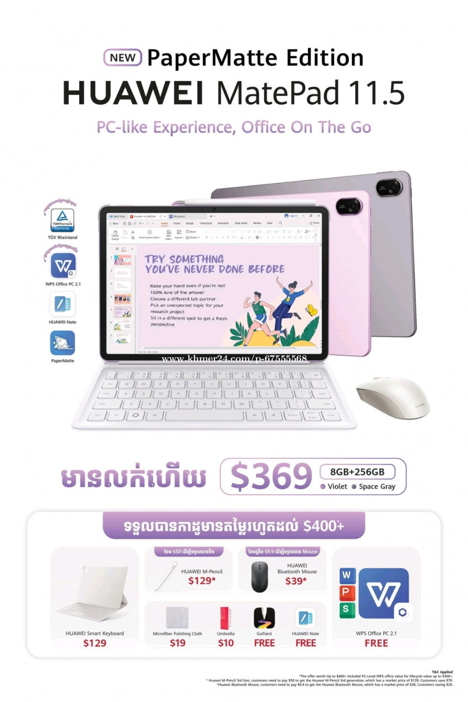 ថេប្លេតជំនាន់ថ្មី HUAWEI MatePad 11.5 PaperMatte Edition Ram 8G memory 256G តម្លៃពិសេស 338$អត់ប៊ិច យកប៊ិចថែម50$ និង wireless mouse ថែម10$ 💥 ទំហំថ្មធំ 10100mAh អាចកំដរការងាររបស់អ្នកមួយថ្ងៃពេញ🔋 ផ្តល់ជូនកាដូសរុបជាទឹកប្រាក់ជាងមានដូចជា៖ 🎁HUAWEI Smart Keyboard តម្លៃ 129$ 🎁ក្រណាត់ជូតអេក្រង់ HUAWEI Original (Microfiber Polishing Cloth) 🎁Free License កម្មវិធី Office កុំព្យូទ័រ Version (PC-Level WPS Office 2.1) ពេញមួយជីវិត 🎁Free License កម្មវិធីគូរគំនូរ GoPaint ពេញមួយជីវិត 🎁Free License កម្មវិធីកត់ត្រា HUAWEI Note ពេញមួយជីវិត មានធានា១ឆ្នាំពីក្រុមហ៊ុន មានលក់ដុំ និង រាយ អាចផ្ញើរទៅខេត្តតាមឡានក្រុងបាន សំរាប់អតិជននៅភ្នំពេញ ដឹកជូនឥតគិតថ្លៃ Tel:099997xxxClick To Call/067555xxxClick To Call ហាងយើងខ្ញុំនៅខាងក្រោយ បុរី អ័រគីដេ ផ្លូវ:2004 ផ្ទះលេខ:205B ផ្លូវ:បូរីភ្នំពេញថ្មី សង្កាត់:ទឹកថ្លា ខណ្ឌ:សែនសុខ ភ្នំពេញ Google map: https://maps.app.goo.gl/BTrzHAVkDpraosrC6