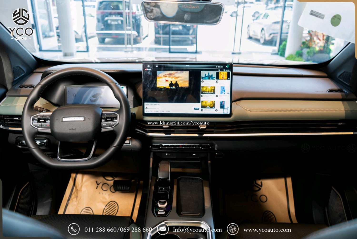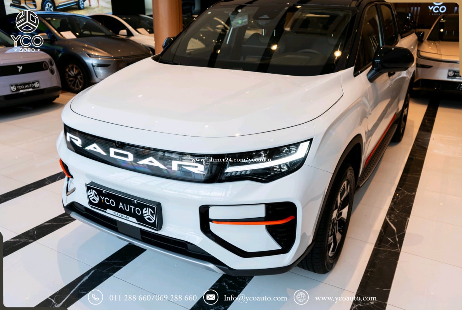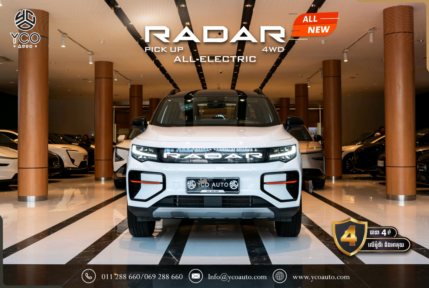 ទំហំរថយន្ដ (Dimensions) ប្រវែង*ទទឹង*កម្ពស់(mm): 5260*1900*1880 គម្លាតកង់(mm): 3120 ទម្ងន់រថយន្ដ Curb weight(kg): 2205 ទម្ងន់ផ្ទុក Gross Weight (kg): 3345 កៅអី(Seats): 5 ទំហំកង់ (Inches): 18 (Newbustar) មាត្រដ្ឋានរថយន្ដ (Performance) ប្រភេទម៉ូទ័រ2 (4WD): ប៉ុងមុខ ក្រោយ ជម្រើសបើកប4+: Eco,Comfort,Sport, (Snow/Mud/Off-Road/Wading +) សន្ទុះល្បឿន(s): 0 ទៅ 100Km/h (4.5វិនាទី) ល្បឿនអតិបមាៈ 190km/h ប្រភេទហ្វ្រាំងៈ Disc ថាមពលរថយន្ដ (Powertrain) កម្លាំងសេះមុខ ក្រោយ (kW): 315 កម្លាំរមួលមុខ ក្រោយ (N.m): 594 ប្រភេទអាគុយៈ Lithium iron phosphate អគ្គីសនី(km): 460 ទំហំថ្ម(kWh): 73 សាកល្បឿនលឿន120kWh (20-90%): 25min (13$) សាកនៅផ្ទះ 7kWh (20-90%): 7h (8$) ផ្នែកខាងក្រៅ (Exterior) ដំបូលលើបិត បើកអូតូ កញ្ចក់ដៃទ្វាមានស៊ុម ក្លុបមុខចំណុះ70 លីត្រ បាំងក្រោយផ្ទុកទម្ងន់ 865kg កម្លាំងអូសទាញ 3000kg កញ្ជក់សងខាងថយក្រោយអូតូ មានសម្ងួតកម្ដៅ មុខងារសម្អាតកាមេរ៉ាខាងក្រោយ ផ្លិតទឹកបើកស្វ័យប្រវត្តិពេលភ្លៀង ភ្លើងបំភ្លឺផ្លូវឡើង ចុះអូតូ អំពូលកុជសងខាង 10គ្រាប់ ភ្លើងប៉ាណាLogo Radarមុខជះចេញក្រៅ ប្រព័ន្ធចង្កៀងមុខ LED ភ្លើងពេលថ្ងៃLED ចង្កៀងក្រោយLED ផ្នែកខាងក្នុង (Interior) ដំបូលខាងក្នុងការពារកម្ដៅថ្ងៃបិត បើកអូតូ ចង្កូតអេឡិចត្រូនិចអាចកំណត់បាន ចង្កូតមានមុខងារកម្ដៅចង្កូត កៅអីមុខ អូតូ រុនទាញភ្លើង10A 2កន្លែង រុនទាញភ្លើង16A 2កន្លែង រុនសាកភ្លើង2.2kw 1កន្លែងAC 220V រុនUSB3 (1 Type C + 2 Type A) កន្លែងដាក់ស៊ីមកាត1 ប្រព័ន្ធប្រតិបត្តិការ/ ភាពងាយស្រួល(Operation/ Convenience) អេក្រង់កំសាន្ត14.6 អ៊ីញ អេក្រង់តាបឡូ10.2 អ៊ីញ ប្រព័ន្ធតភ្ជាប់Bluetooth+WiFi Smart Key Bleutooth ប្រព័ន្ធភ្ជាប់ស៊ីម4G/5G កន្លែងសាកថ្ម1 Wireless Charging ប្រព័ន្ធបញ្ជាតាមApp Control Andriod System (Youtube/Play store….) កាំមេរ៉ា 360 ដឺក្រេ (Degrees Camera) Speaker 8គ្រាប់ (DTS sound effects) កាំមេរ៉ាថតចម្លង Camera Record បញ្ជាដោយសំឡេង Voice Command ប្រព័ន្ធបង្ហាញទម្រទម្ងន់ស្វ័យប្រវ័ត្ដិ ប្រព័ន្ធសុវត្ថិភាព (Safety) ពោងសុវត្ថិភាព 4 ប្រព័ន្ធកំណត់ល្បឿន ចាប់ហ្វ្រាំងអូតូ មុខក្រោយនិងមុខងារឈប់ស្ដុបអូតូ ប្រព័ន្ធរំញ័រយានជំនិៈជុំវិញឡាន មុខងារជូនដំណឹងពេលចេញដំណើរ ប្រព័ន្ធចាប់កន្លងផ្លូវ ប្រព័ន្ធជូនដំណឹងពេលវ៉ា ជែង ប្រព័ន្ធវាស់សម្ពាធកង់ ថែមជូនពិសេស🎁🎀🎊🎉 Free ឆ្នាំងសាក7.kWh តំឡើងដល់ផ្ទះ Free ឆ្នាំងសាកចល័ត 3.5kWh Free ដឹករថយន្តដល់ផ្ទះ (ភ្នំពេញ) Free UV ការពារកម្ដៅថ្ងៃ Free ស្កុតការពារទឹកថ្នាំឡាន1ជុំ Free សេវាកម្មថែទាំ 1ឆ្នាំ Free ម៉ួកYCO 1 ដ៏ស្រស់ស្អាត Free អាវ YCO 1 យ៉ាងទាន់សម័យ Free កាបូបYCO 1 ដាក់កាតស្រស់សោភា Free អាហារពេលល្ងាច 1ពេល Free Voucher 200$ សម្រាប់ទិញសម្លៀកបំពាក់នៅអ៊ីកូ ធានា 4ឆ្នាំ ឬ 48,000គីឡូម៉ែត្រ និងមានថែមជូនការដូរជាច្រើនផ្សេងទៀត ប្រញាប់ឡើងបងៗស្ដុកមានកំណត់🚗🌹🎉🎊💐 ផ្ដល់ពត៍មានទូទៅ: 011288xxxClick To Call/011288xxxClick To Call/069288xxxClick To Call ផ្ដល់ព័ត៍មានជួសជុស ថែទាំ: 017288xxxClick To Call ទីតាំង: លើផ្លូវជាតិលេខ1 ក្បែរច្រកចូលបុរីប៉េងហ៊ួត បឹងស្នោ