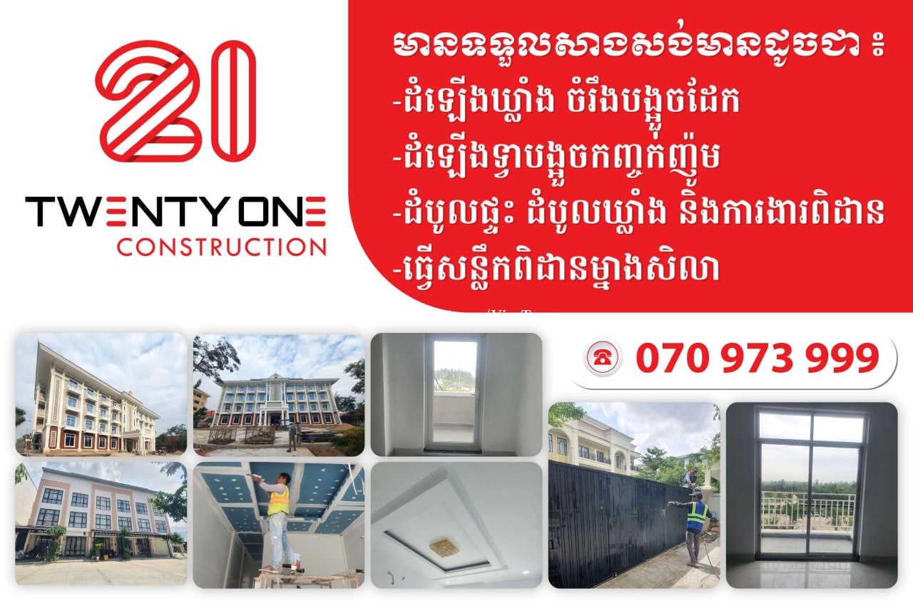 👉 សេវាកម្មយើងខ្ញុំមានទទួលម៉ៅការ និងសាងសង់៖ ✅ ចម្រឹងដែក ទ្វា បង្អួច បង្កាន់ដៃជណ្ដើរ និងវ៉េរ៉ងដាផ្ទះ ✅ ដំបូលផ្ទះ និងសំយ៉ាប (ស័ង្កសី ឬក្បឿង) ✅ ការងារកញ្ចក់ និងអាលុយមីញ៉ូម ✅ ទ្វារបងធំ តូច គ្រប់ម៉ូត ✅ ពិដានគ្រប់ម៉ូត ✅ ឃ្លាំងតូច ធំ ✅ ការងារដេគ័រគ្រប់ប្រភេទ ✅ ការងារសំណង់ទូទៅគ្រប់ប្រភេទ ⭐️⭐️⭐️ អ្វីដែលកាន់តែពិសេស អតិថិជនក៏អាចទំនាក់ទំនង និងព្រឹក្សាយោបល់ជាមួយក្រុមការងារយើងខ្ញុំដោយឥតគិតថ្លៃផងដែរ | Free Consultant 👷🏼 📍ទីតាំង៖ ភ្នំពេញ និងតាមបណ្តាខេត្ត 📥 សម្រាប់ព័ត៍មានលម្អិត សូមទាក់ទងមកកាន់៖ ☎️ លេខទូរស័ព្ទ៖ 070973xxxClick To Call | 070927xxxClick To Call | 016694xxxClick To Call 📲 Telegram: t.me/construction_021 🎵 Tiktok: https://www.tiktok.com/@21construction ✨ ទំនុកចិត្ត គុណភាព និងតម្លៃសមរម្យ 👷⏰💰 #21_Construction #ការងារដែកកញ្ចក់ #ការងារពិដាន #ការងារដេគ័រ #ការងារឃ្លាំង #ម៉ៅការសំណង់គ្រប់ប្រភេទ