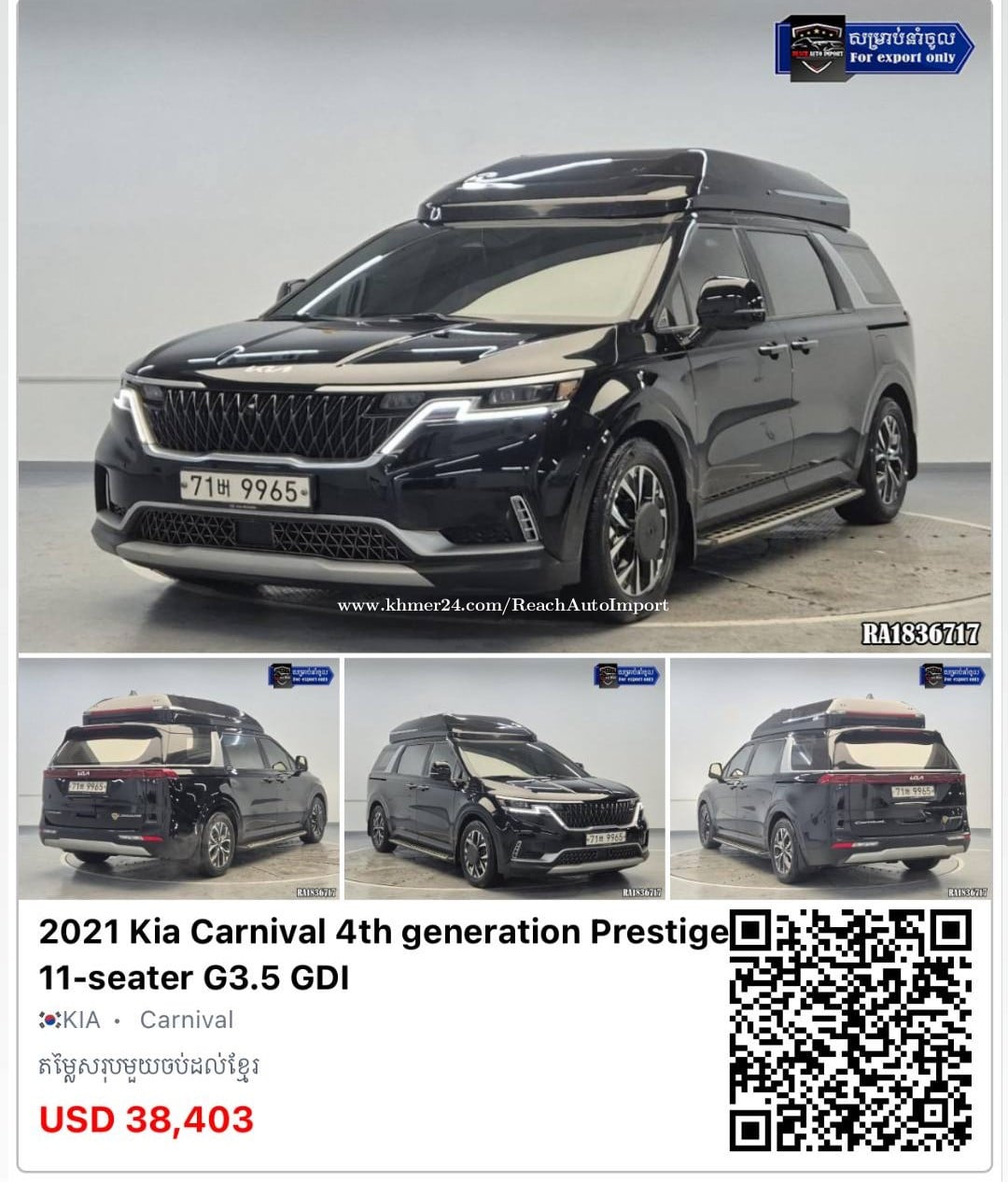 រថយន្តសម្រាប់កុម្ម៉ង់នាំចូល | #RA1836717 2021 Kia Carnival Prestige G3.5 GDI V6 ម៉ាស៊ីនសាំង 11កៅអី 💵បញ្ជារទិញឥលូវនេះក្នុងតម្លៃនាំចូលសរុបត្រឹមតែ $38,403 - តម្លៃឡាននាំចូលសរុប $37,603 - សេវាជួយបញ្ជារទិញ និងនាំចូល $800 👇ចុចមើលព័ត៏មានលម្អិតលើវែបសាយ https://www.reachautoimport.com/cambodia-ra1836717-2021-kia-carnival-4th-generation-prestige-11-seater-g35-gdi-post-3584 ============== 👉Reach Auto Import សេវាជួយបញ្ជារទិញរថយន្តគ្រប់ប្រភេទពីប្រទេសកូរ៉េ ប្រកបដោយគុណតម្លៃ សុវត្ថិភាព និងការទទួលខុសត្រូវខ្ពស់ជូនអតិថិជន 🔍ស្វែករថយន្តម៉ូឌែល Kia Carnival 2021-2023 ផ្សេងទៀត https://www.reachautoimport.com/list?page=1&make=C0810&subModel=C1150&modelYearFrom=2021 📲 Find us on social 👉 Facebook Page: Reach Auto Import 👉 Telegram Channel: https://t.me/ReachAutoImportChannel 👨💻 ទាក់ទងព័ត៏មាននាំចូល ☎️ +8558780xxxClick To Call9 ☎️ +8559280xxxClick To Call9 (Telegram, WhatsApp) ================== 📍 ទីតាំងការិយាល័យនាំចូល: D4A8, St.3 (បុរីLV) ទួលពង្រ 👉 ស្វែងរកទីតាំងលើGoogle Map : https://shorturl.at/WzBpN សូមអរគុណ!