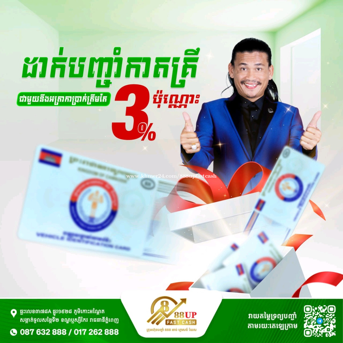[English & 中文 Below ] ⚡️ ទទួលបញ្ចាំកាតគ្រីរថយន្ត គ្រប់ប្រភេទ! 🔥 ពិសេស! អត្រាការប្រាក់ត្រឹមតែ 3% 😍 💡 ងាយស្រួល! លឿនរហ័សទាន់ចិត្ត! ---------------------------------- ⚡️ We accept all types of Car Title/Registration Cards for pawning! 🔥 Special! Interest rate is only 3%! 😍 💡 Easy! Fast and instant speed! ---------------------------------- ⚡️ 接受所有类型的汽车产权证典当! 🔥 特别优惠!利率仅 3%! 😍 💡 简单!快速便捷! 📌អាសយដ្ឋាន/Address: House 378A, St. 1928, Koh Andet Village, Toul Sangke 2 Commune, Russey Keo District, Phnom Penh. 📍ទីតាំងហាង/Location : GOOGLE MAP 📲ព័ត៌មានបន្ថែម/More info click here : CHANNEL 📈វាយតម្លៃចុចទីនេះ/Quick assessment click here: TELEGRAM 🌐Website: 888UPFC.COM ☎️ Tel : 087632xxxClick To Call / 017262xxxClick To Call #PawnShop #888UpFastCash #PawnShopCambodia #LowInterestRate