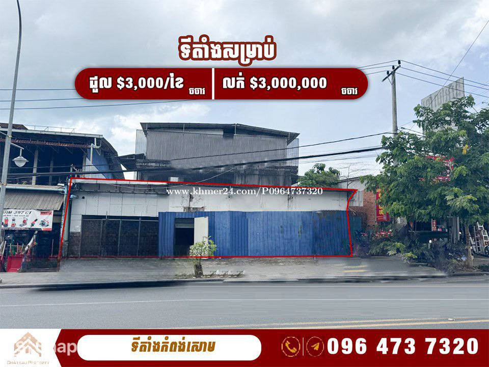 ទីតាំងសម្រាប់លក់ និងជួល នៅខេត្តកំពុងសោម| Locations for sale and rent Road Sihanouk Province *តម្លៃលក់ | Sale Price: $3,000,000 *តម្លៃជួល | Sale Rent: $3,000 *ទំហំដី | Land Size: 18m x 55m *ទីតាំង| Location: ខេត្តកំពុងសោម _____________________________ Property Code: (9152)