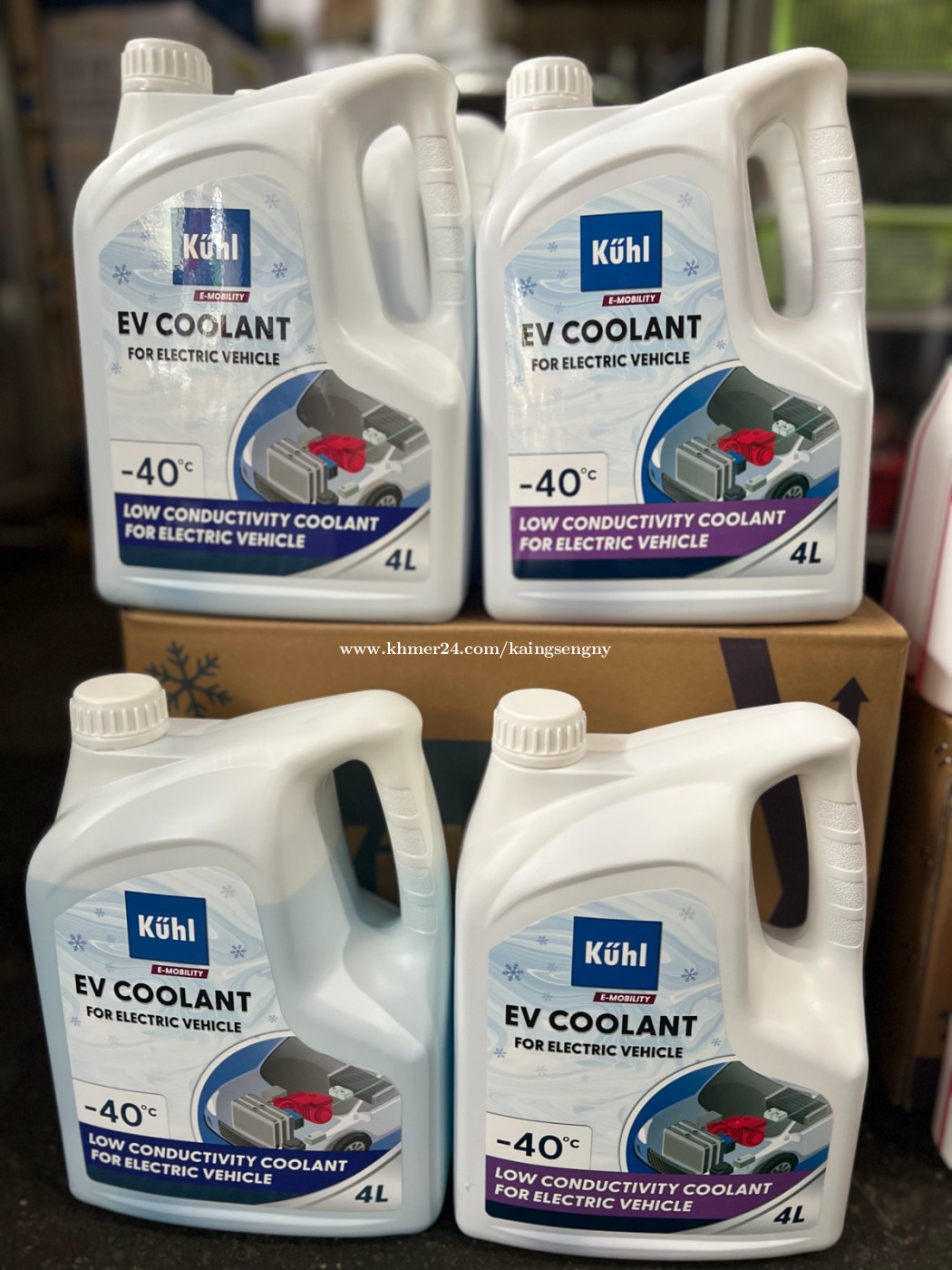 ទឹកស្អំ សម្រាប់ឡាន អគ្គីសនី ចំណុះ 4លីត្រ ផ្តោតលើឡានទូទៅ ពណ៏ខៀវ នឹង ឡាន BYD ពណ៏ស្វាយ Coolant for electric car Kuhl Germany Technology