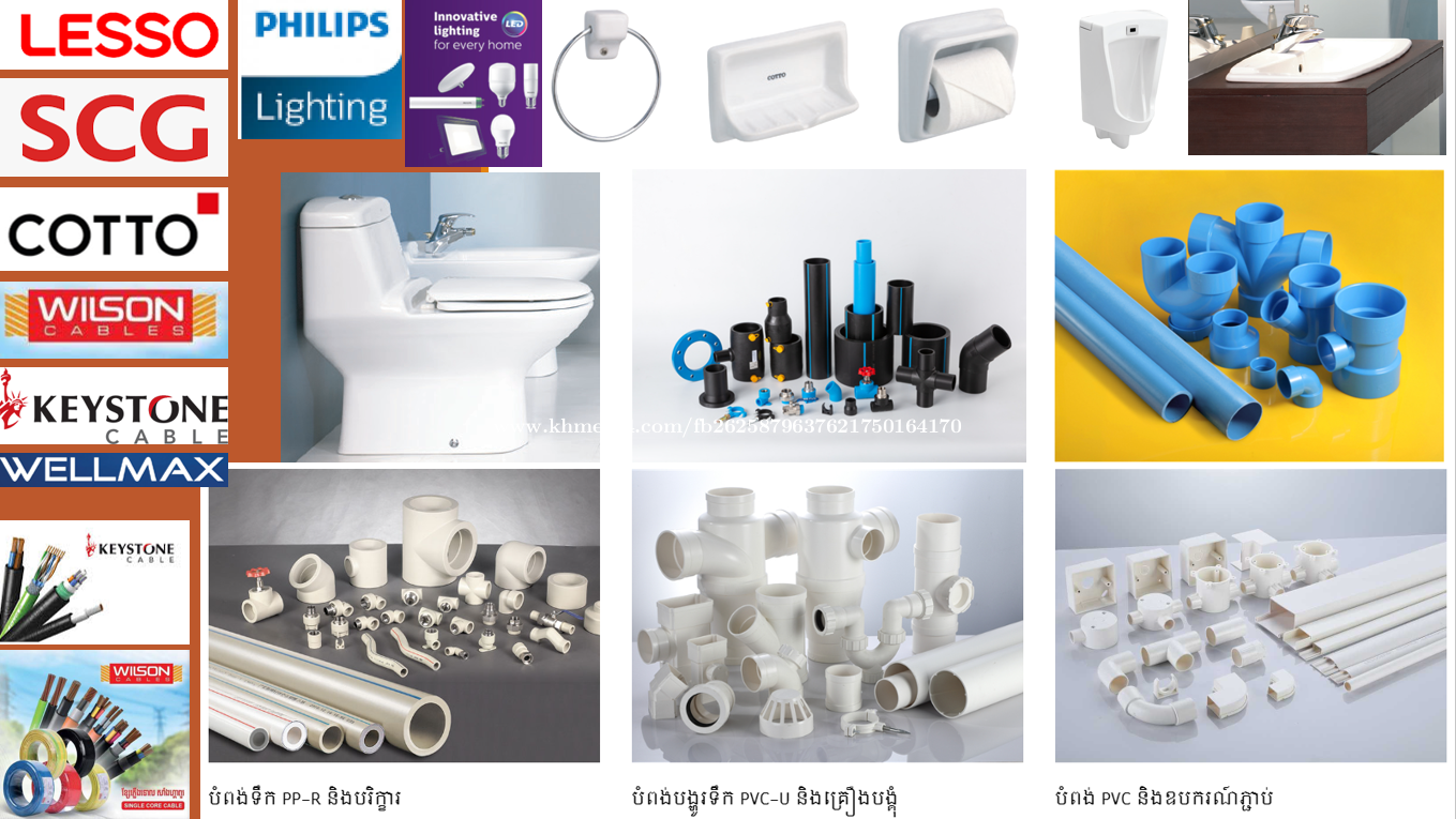 មានផ្គត់ផ្គង់ (Telegram: t.me/construction_Materials_096440xxxClick To Call) ទុយោទឹក ទុយោខ្សែភ្លើង និងសំភារៈបន្ទប់ទឹក Lesso, SCG, COTTO. ខ្សែភ្លើង WILSON & KEYSTONE អំពូលភ្លើង PHILIPS & WELLMAX ទំទាក់ទំនងតាមតេលេក្រាមដូចដែលបានភ្ជាប់