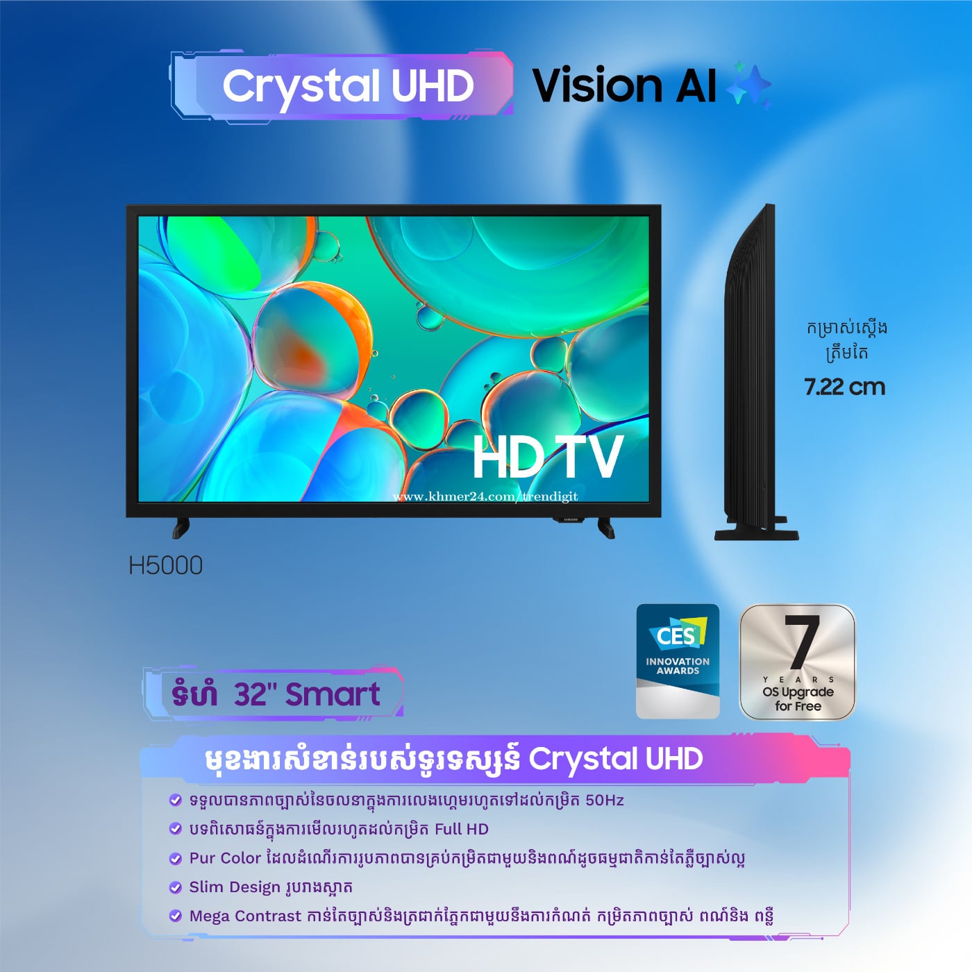 ទូរទស្សន៍ Samsung Smart TV 32” បំពាក់មកជាមួយបច្ចេកវិទ្យា PurColor ធ្វើអោយកូល័របែបធម្មជាតិ ច្បាស់ត្រជាក់ភ្នែក និង សំឡេងខ្លាំងរហូតដល់ 20W អេមហ្ម៎ង ធ្វើឱ្យការកម្សាន្តកាន់ តែជក់ចិត្ត។ មានការធានារយៈពេល ៣ ឆ្នាំ លោកអ្នកអាចស្វែងរកបាននៅ Trendigit-ដ្រេនឌីជីឌ! សូមចុចត្រង់នេះសម្រាប់ព័ត៌មានបន្ថែម 098877xxxClick To Call (Telegram) https://t.me/Trendigit_yi