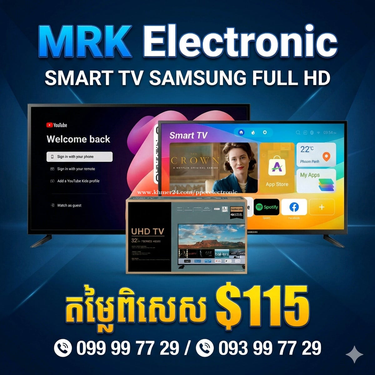 ទូរទស្សន៍ SMART TV SAMSUNG FULL HD តម្លៃពិសេស! សូមណែនាំទូរទស្សន៍ Smart TV ម៉ាក Samsung គុណភាព Full HD ដែលផ្តល់ជូននូវបទពិសោធន៍ទស្សនាដ៏អស្ចារ្យ។ ភ្ជាប់មកជាមួយមុខងារឆ្លាតវៃ ដែលអនុញ្ញាតឱ្យអ្នកចូលប្រើប្រាស់កម្មវិធីពេញនិយមដូចជា YouTube, Netflix និងកម្មវិធីកម្សាន្តជាច្រើនទៀតបានយ៉ាងងាយស្រួល។ អេក្រង់ច្បាស់ត្រជាក់ភ្នែក រូបភាពរស់រវើក។ តម្លៃពិសេសត្រឹមតែ $115 ប៉ុណ្ណោះ! មានលក់នៅ MRK Electronic។ សម្រាប់ព័ត៌មានបន្ថែម ឬកុម្ម៉ង់ទិញ សូមទាក់ទងលេខទូរស័ព្ទ៖ 099997xxxClick To Call / 093997xxxClick To Call។