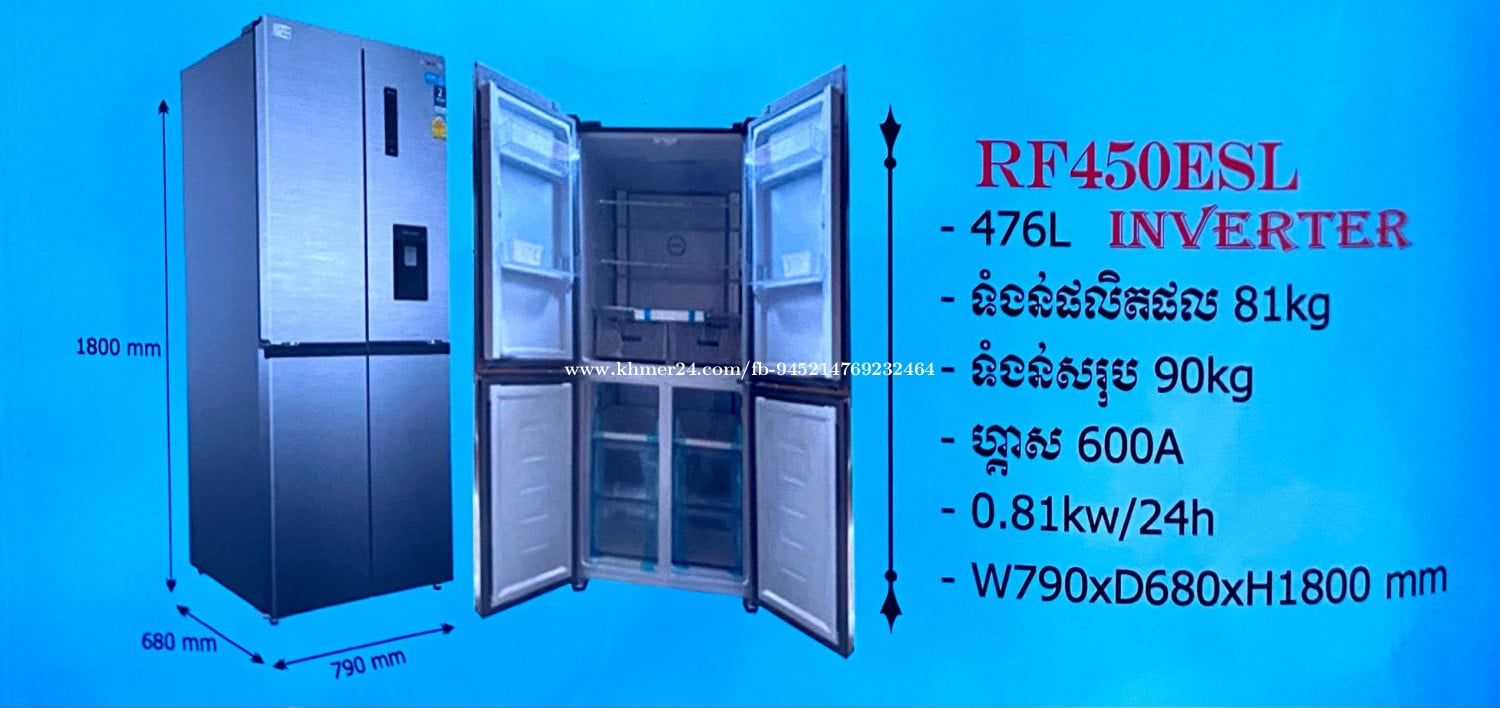 ទូរទឹកកកទ្វារបួន កកក្រោមត្រជាក់ខាងលើមានធានា២ឆ្នាំ នៅភ្នំពេញហ្រ្វីដឹក 078999xxxClick To Call
